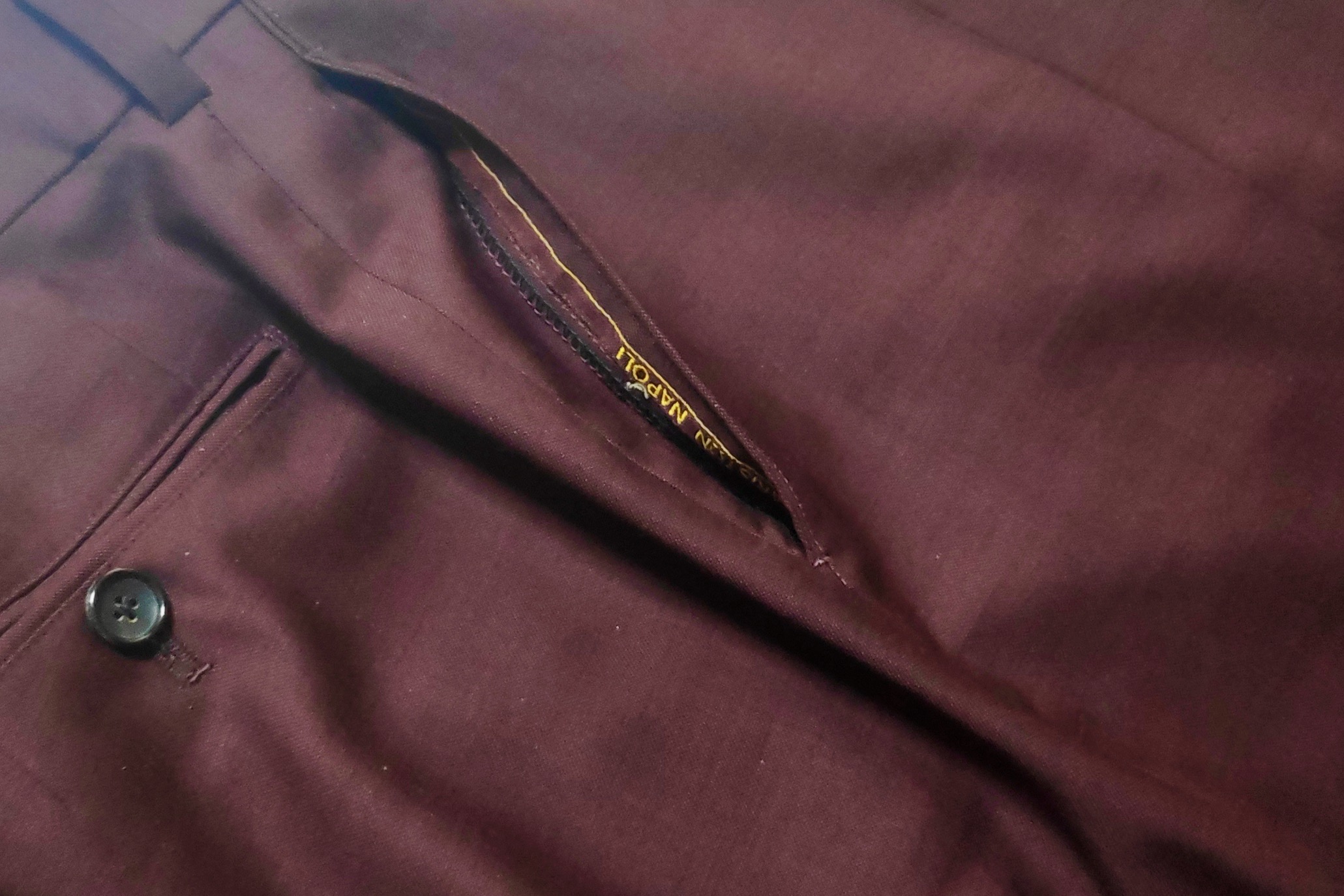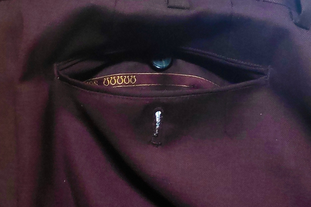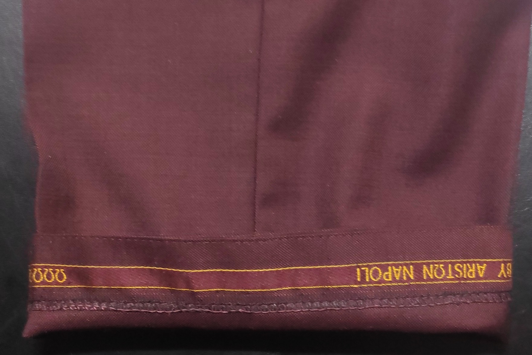 자 이건 이 글 적다가 찍은 내 와인색 수트 바지다. 아래쪽을 뒤집으면 이렇게 셀비지가 나온다. 그래서 지인에게 설명을 해주니 지인이 입고 있던 바지 아래쪽을 본인이 들추더라. 셀비지 있네. 보니까 까노니꼬네. 그런 식으로 셀비지가 있어야 한다고 했다. 원단 끝부분에 셀비지는 다른 데는 쓰일 수 없기 때문에 눈에 안 보이는 안쪽에 사용하는데, 그렇게 활용되는 부분이 바지 아래쪽이랑 포켓 안쪽이다.