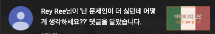 내 영상에는 정치적 견해 올려도 되고, 댓글에는 언급되는 것 못 보겠다는 건가? 또 넘겨짚기 식이다. 진실은 이태리 3대 원단에 왜 이런 댓글이 달리지? 그리고 질문 자체가 의도가 가진 듯 보여서 의도를 물어봤고, 첫번째 질문 자체가 하도 앞뒤 다 잘라먹고 예스야 노야 식의 질문이라 엄마가 좋아 아빠가 좋아 식의 질문이라고 얘기해줬었는데, 이렇게 얘기하는 거다. 그러니까 의도를 가진 이들은 항상 이런 식으로 얘기를 해. 수준이 낮아. 얘네들이 알고 싶은 거? 내가 지 편이냐 아니냐 그것 외에는 없어.