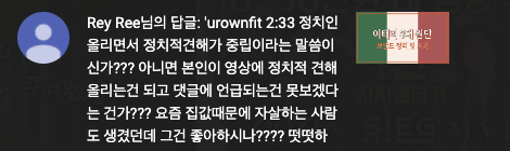유어오운핏 채널에 달린 댓글 하나. 이 영상에 왜 이런 댓글이 달리나 궁금했다. 이건 나중에 알게된 부분이지만. 여튼 이런 질문은 보통 의도를 갖고서 하는 질문이라, 내가 어떤 답변을 달아봤자 뻔한 결과가 나오기 때문에 피하는 게 상책이다. 그래서 안 달려다가 그냥 좋게 얘기해서 답글을 달았는데, 역시나 또 답글이 달렸다.