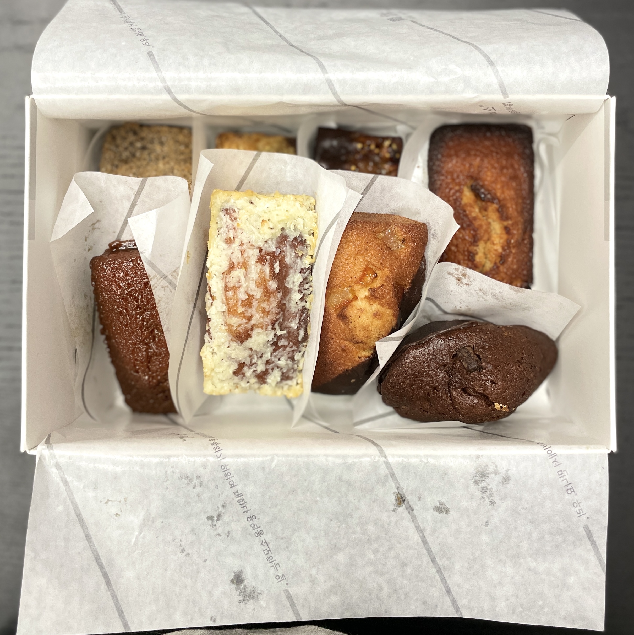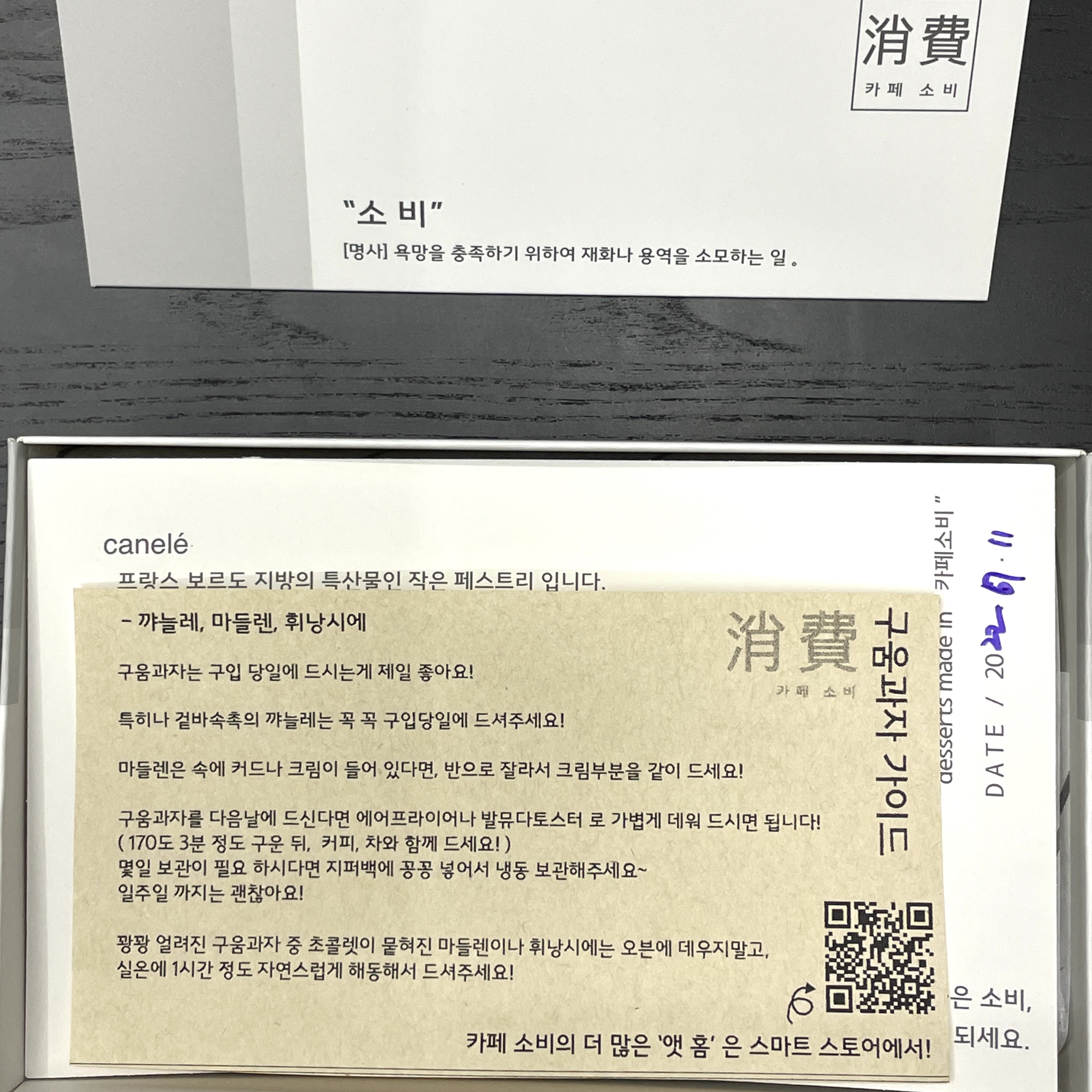스마트 스토어(https://smartstore.naver.com/cafe_sobi/)에서 보니까 이거 26,000원이더라. 오~ 비싼데? 맛있을라나? 마침 그 날 밤새면서 야식으로 먹었는데. 오~ 맛있다! 적혀 있기로는 까늘레, 휘낭시에, 마들렌 이 세 종류이던데, 마들렌 빼고는 글쎄 난 첨 들어봐서.
