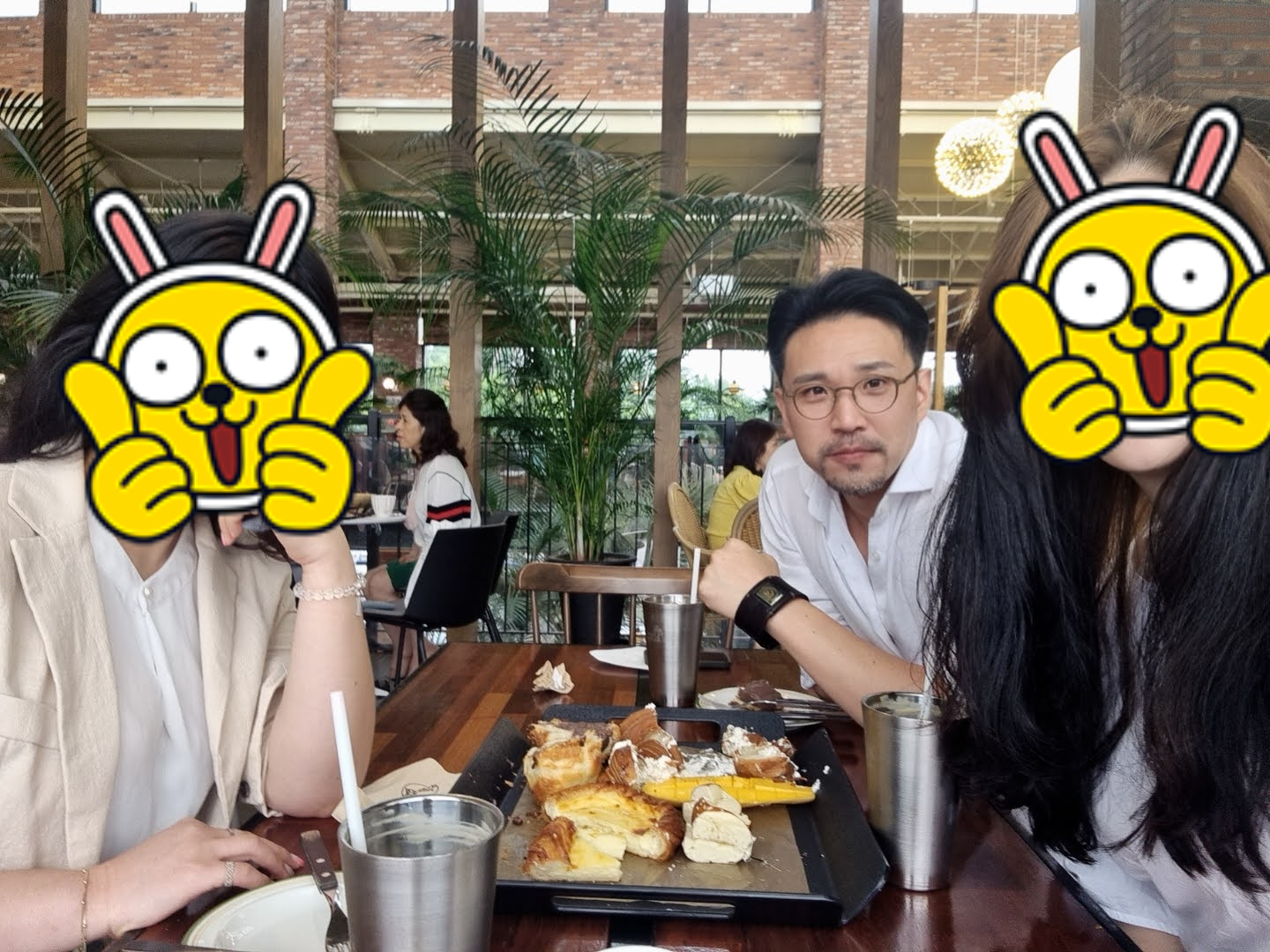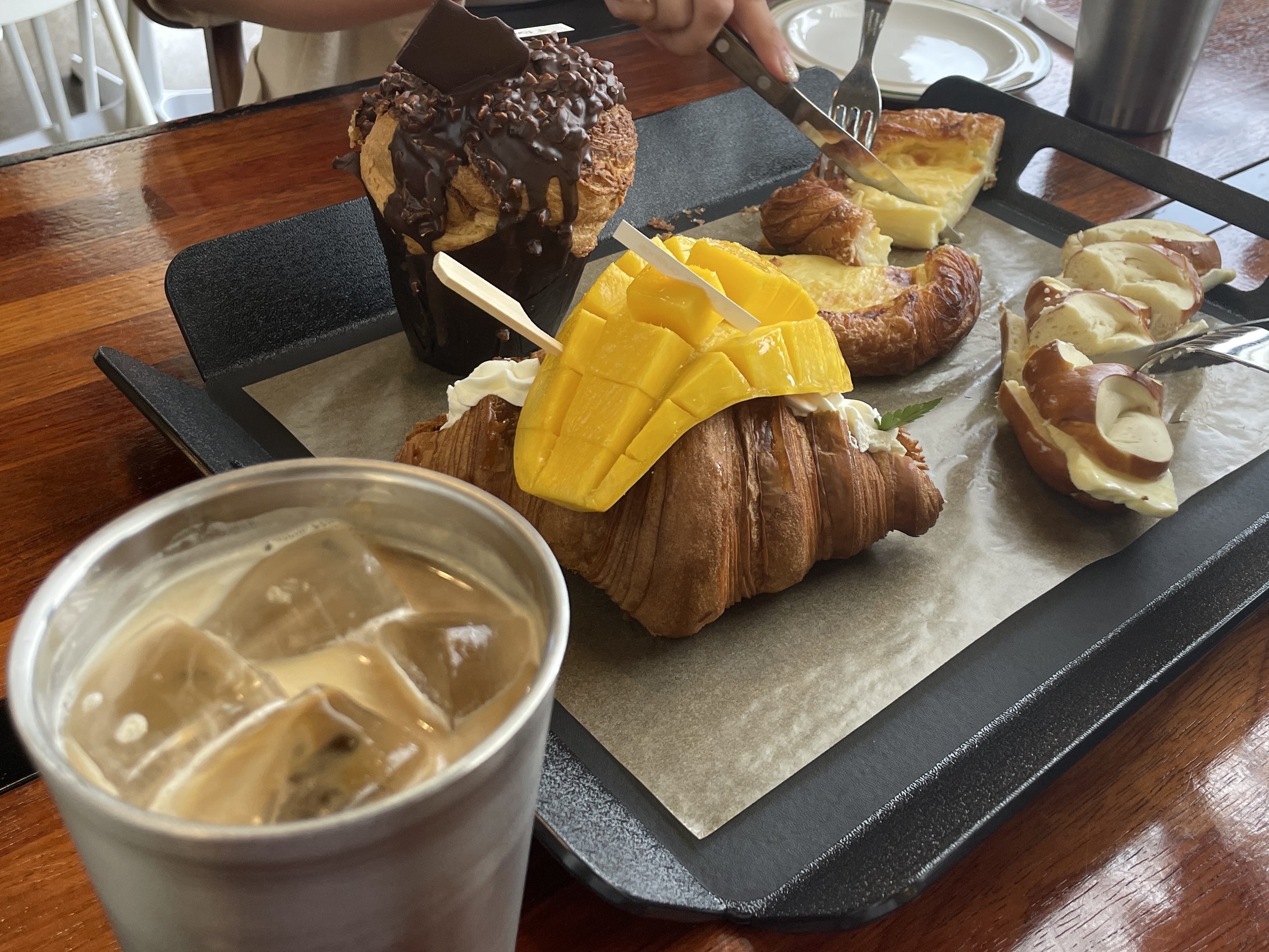 이 날은 베이커리와 커피를 시켰는데, 이 외에도 파스타나 버거도 판다. 근데 대부분 가격대가 일반 카페에 비해서는 높다. 아무래도 자릿세가 포함된 듯한. 베이커리 종류는 엄청 많다 정도는 아니지만 그래도 꽤 많이 있다. 우리가 시킨 건, 초코 크러핀(7,500원), 통 망고 크루아상(10,000원), 에그타페스츄리(6,500원), 버터 프레첼(6,000원). 나는 당연히 달달한 카라멜 라떼. 동생들은 아아. 근데 우리나라 빵값은 엄청 비싸기로 유명하지. 차라리 이 정도면 다른 데서 맛있는 밥을 먹는 게 더 쌀 정도인데, 밥만 먹고 살 순 없으니. 게다가 이런 분위기에서 즐긴다고 생각해야지. 여튼 가격대는 좀 있다.