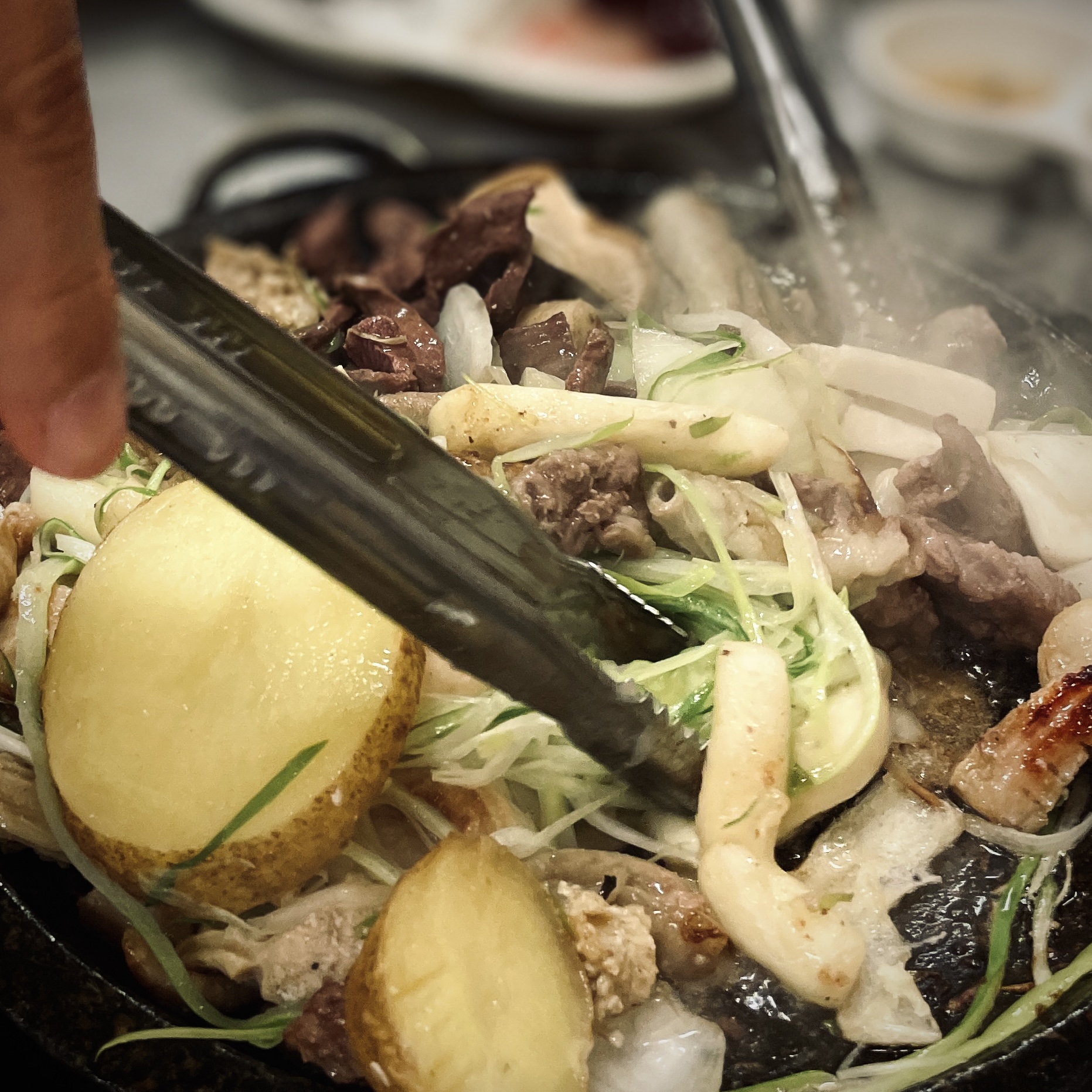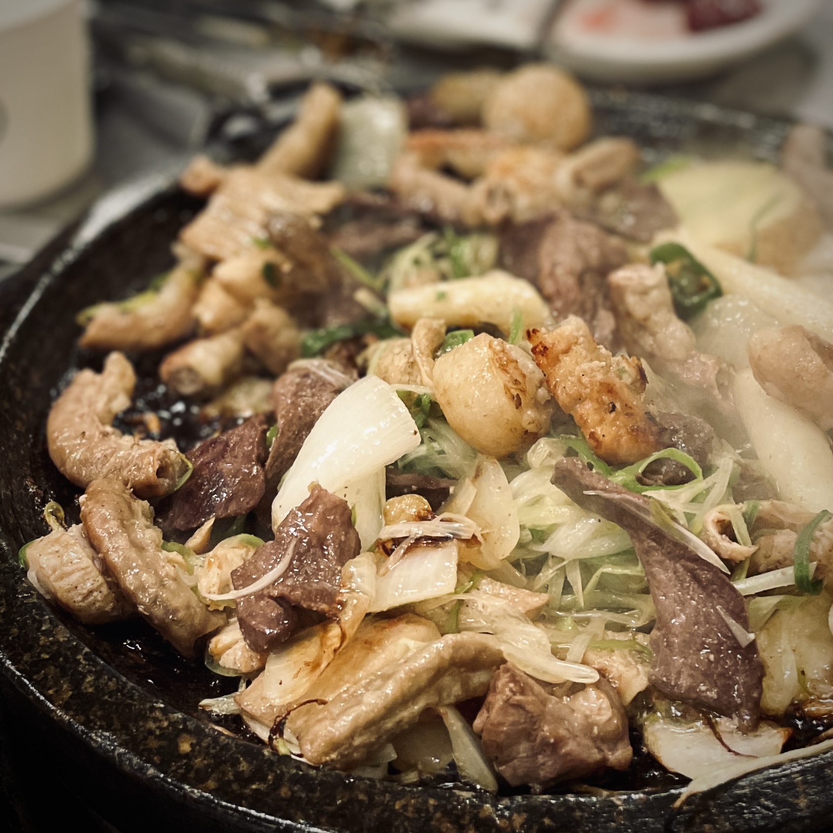 이거 한우 특모듬 한판이다. 소곱창, 대창, 막창, 특양, 염통. 골라 먹는 맛이 있지. 개인적으로 염통은 그닥 즐겨 먹지는 않는다. 식감이나 그런 건 비슷한데 난 조금이라도 비릿하면 못 먹. 내겐 염통이 좀 그래. 구웠는데도 소고기 맛이랑은 좀 달라. 내가 좀 비위에 약해서 해산물 이런 거는 전혀 못 먹는다. 굴 이런 것도 말이지. 개인적으로 맛있었던 건 양. 소곱창은 괜찮긴 하지만 일산에 더 맛있는 데가 있어서.
