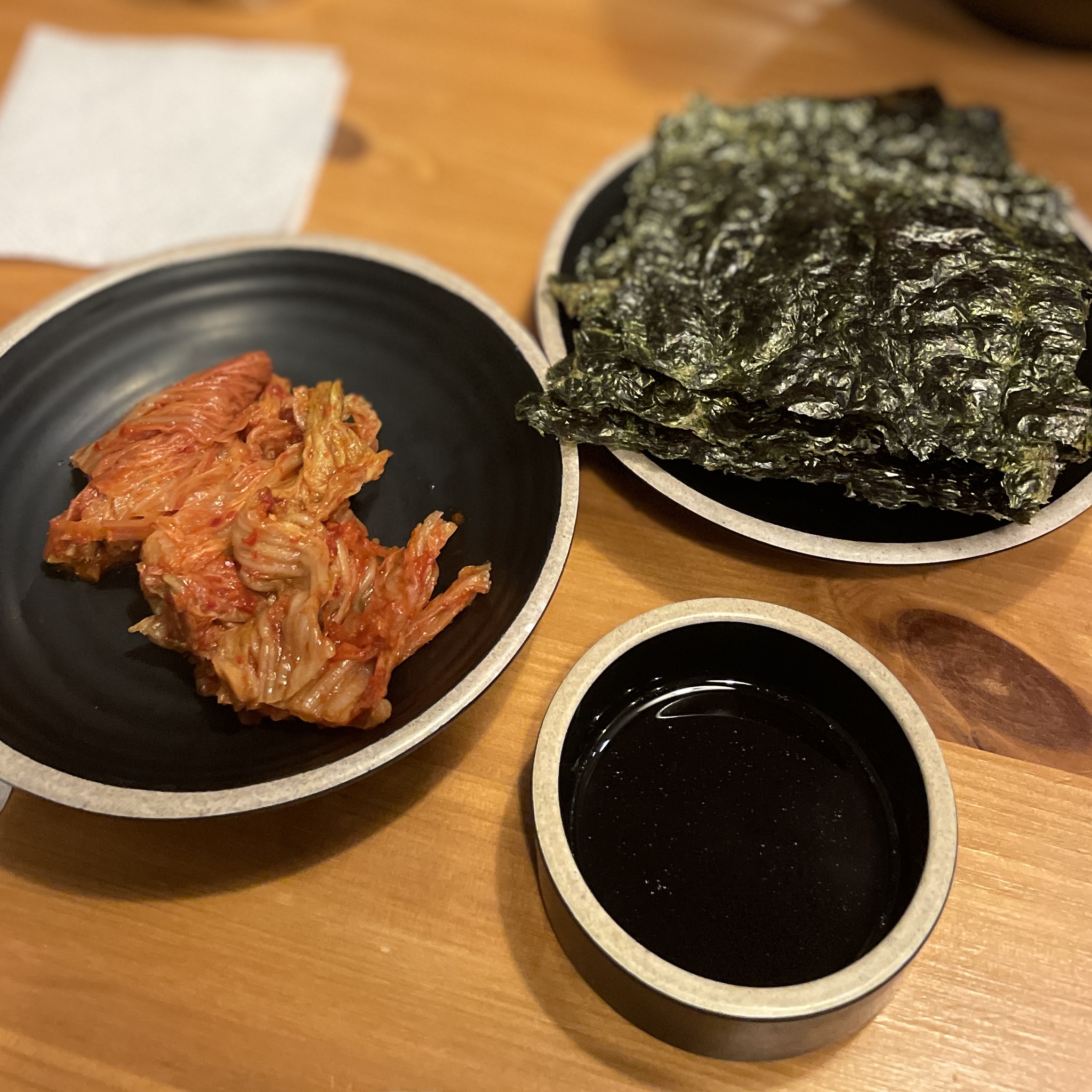 개인적으로 이거는 정말 맛있더라. 구운 김에 익은 김치 그리고 간장. 내 친동생이 구운 김 엄청 좋아하지만 나는 구운 김보다는 참기름 바른 김을 좋아하는데, 이건 정말 맛있었다. 김 자체가 맛있다기 보다는 김치가 맛있어서 계속 싸먹게 되더라는. 이 김치와 김도 남원에서 어머님한테서 공수해온다고 들었다. 부대찌개 나오기 전에 이거 먹다 여기 맛집 맞네 하는 생각이 딱 들더라는. 진짜 부대찌개 없이 이렇게만 있어도 밥 한 공기 다 먹겠더라.