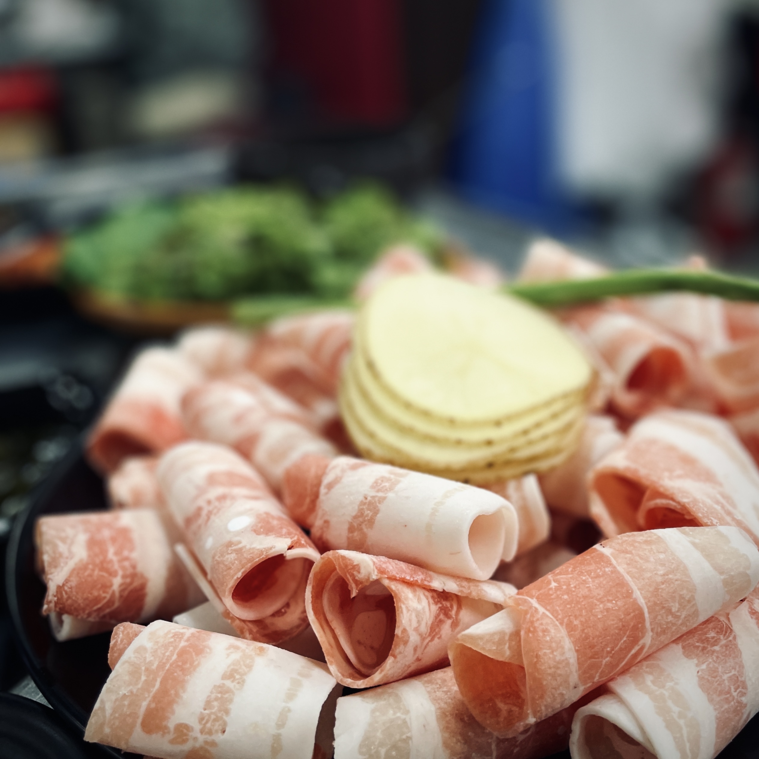 대패삼겹살이라 하여 대패삼겹살만 나오는 게 아니라, 같이 익혀 먹으라고 감자, 김치, 떡, 비엔나 소세지, 아스파라거스도 나온다. 대패삼겹살만 먹는 게 아니라 이것 저것 먹다 보면 배부르다는. 고기 먹을 때는 고기만 먹는 사람이 있는데, 난 소고기나 그렇지 돼지 고기 먹을 때는 밥과 같이 먹는다. 공기밥은 별도로 추가해서 주문해야 되고.