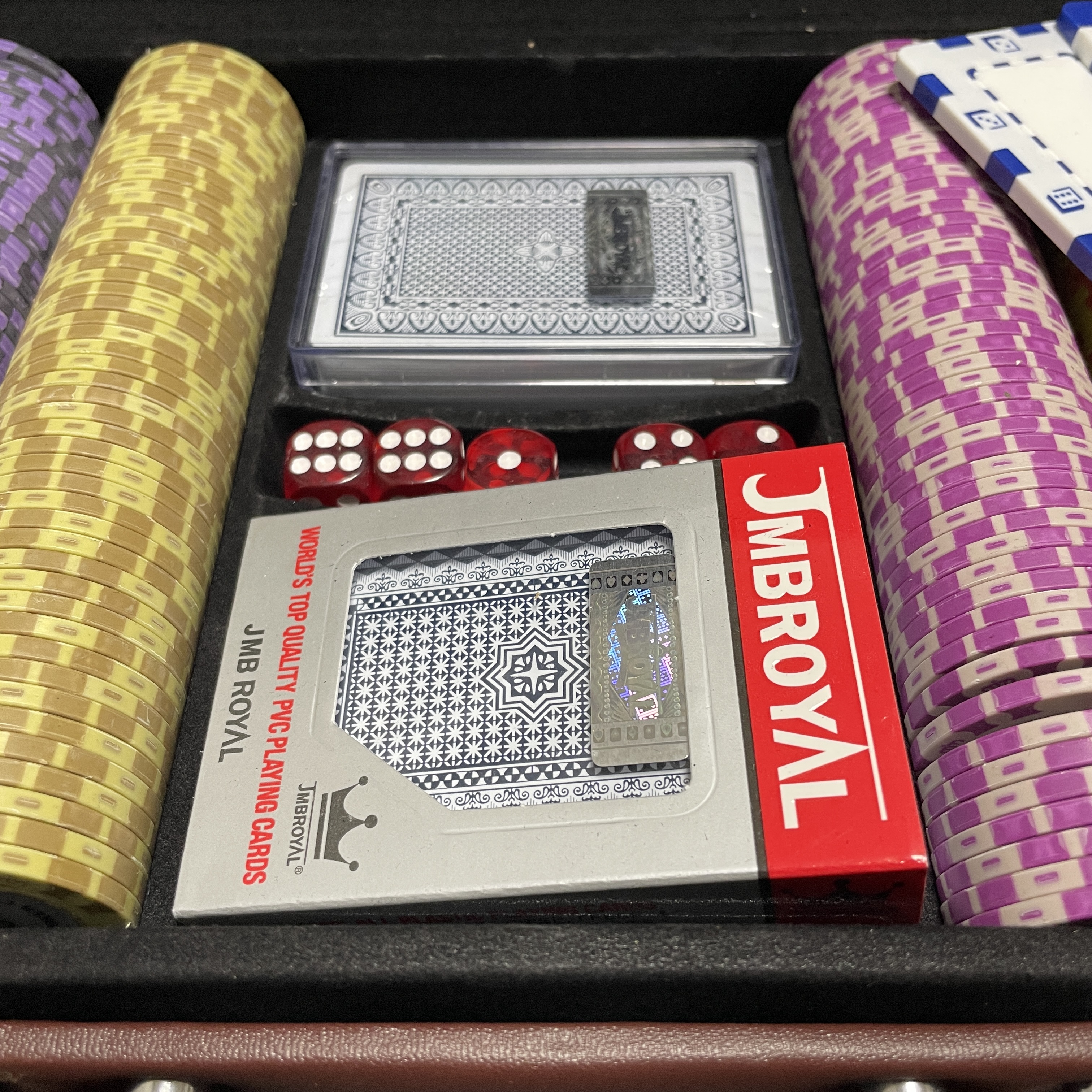 칩은 300p다. 300개짜리란 얘기. 200개부터 있는데, 사실 둘이서만 하려면 200개로도 충분하다 생각하지만 혹시 모르니 여분은 있어야겠다 해서 300p 짜리로 주문했다. 500p는 넘 많은 거 같고. 근데 300p만 해도 개당 14g이면 4.2kg이다. 게다가 가죽 케이스 무게 등을 합치면 들었을 때 생각보다 묵직하더라.