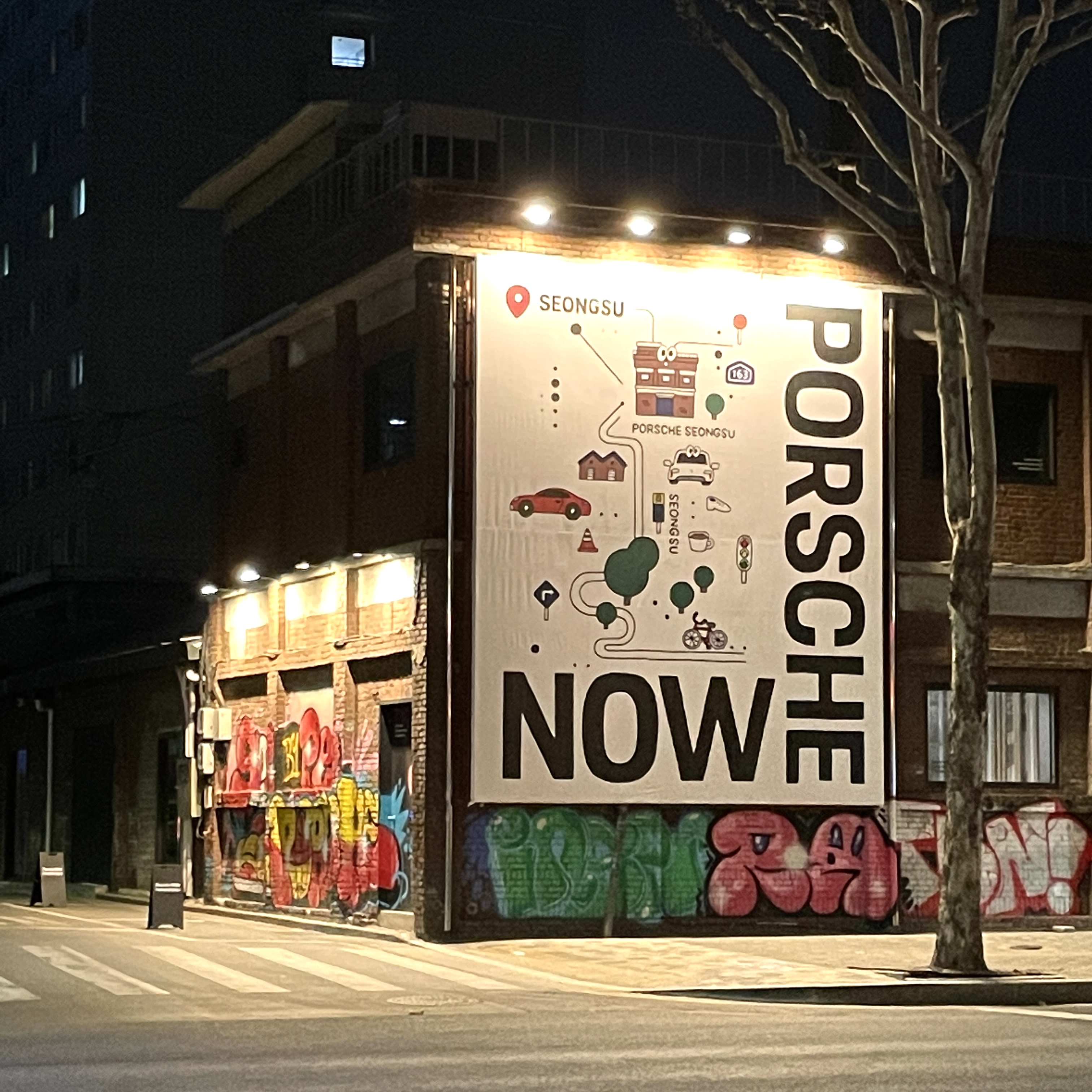 지나가다가 눈에 띄긴 하던데 나는 그냥 포르쉐 옥외 광고 뭐 그런 건줄로만 알았다. 건물에 그래피티(Graffiti Art)도 있고 그래서 말이다. 근데 인근 커피숍 갔다가 돌아오는 길에 건물 안에 멋진 포르쉐가 있길래(포르쉐 타이칸 크로스 투리스모 모델로 안다.) 그거 밖에서 구경하다가 보니까 커피숍 갈 때 보던 그 건물이더라. 그러니까 포르쉐라고 적힌 게 간판이었던. 성수동은 참 요상한 동네다. 뭔가 어울리지 않는 조합들로 구성된 데가 많은 듯. 글쎄 그래서 볼 만하고 힙하다고 할 지는 모르겠지만 나는 뭔가 언밸런스한 느낌이라 영 적응이 안 되네.