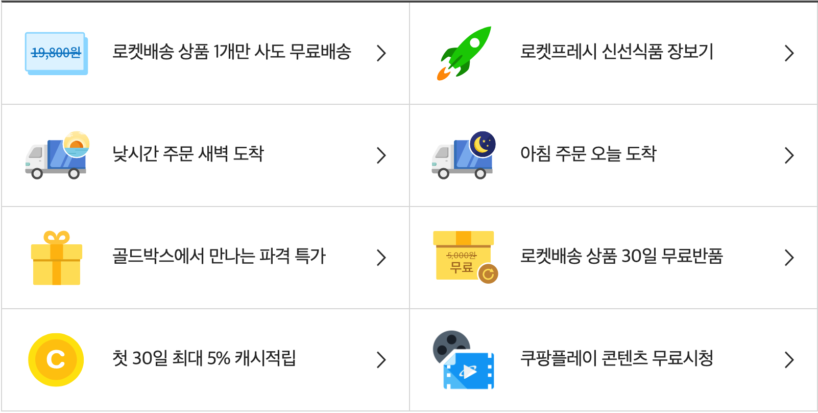 이건 쿠팡 와우 멤버십 혜택이다. 이 모든 걸 다 혜택받지는 못한다. 하나씩 따져보면,