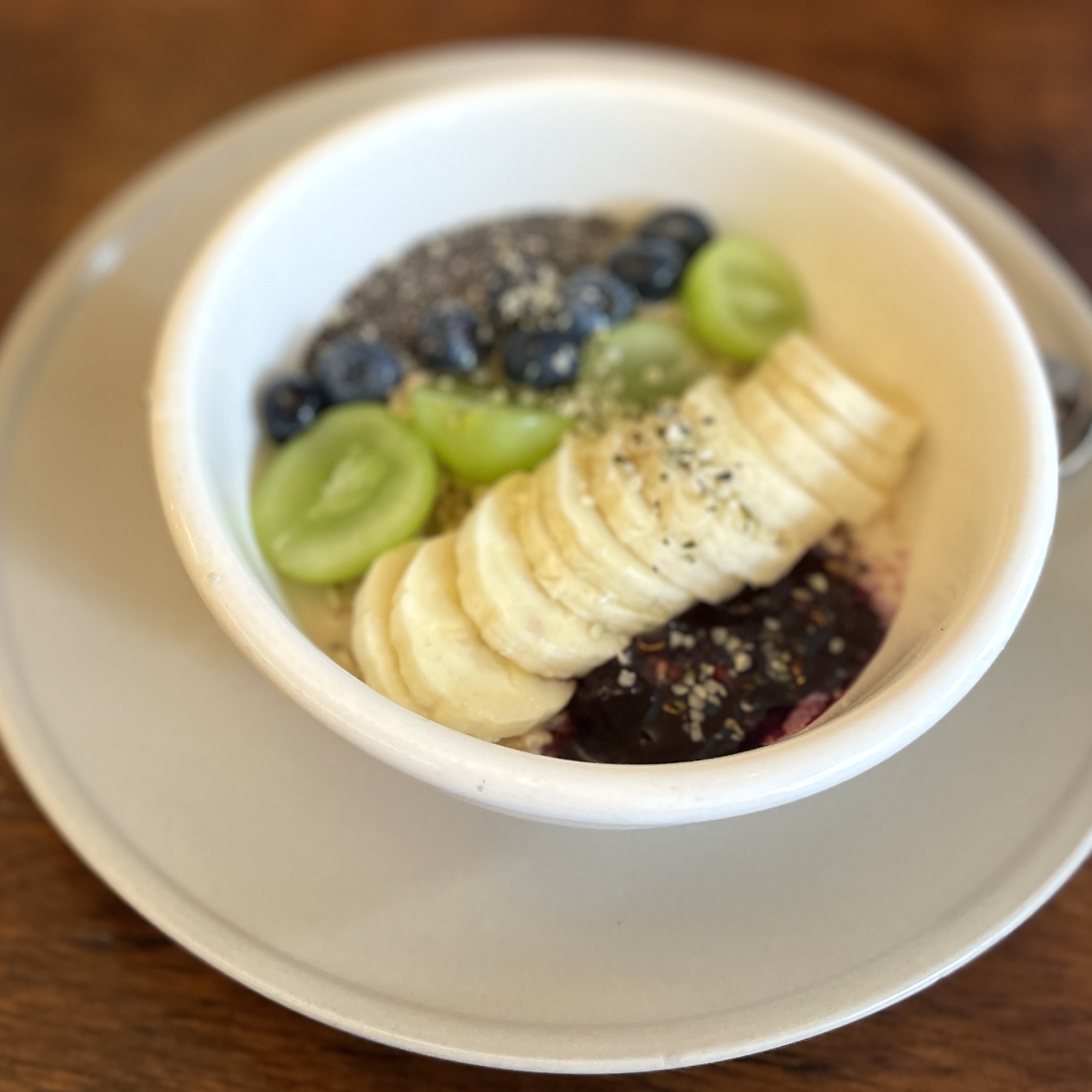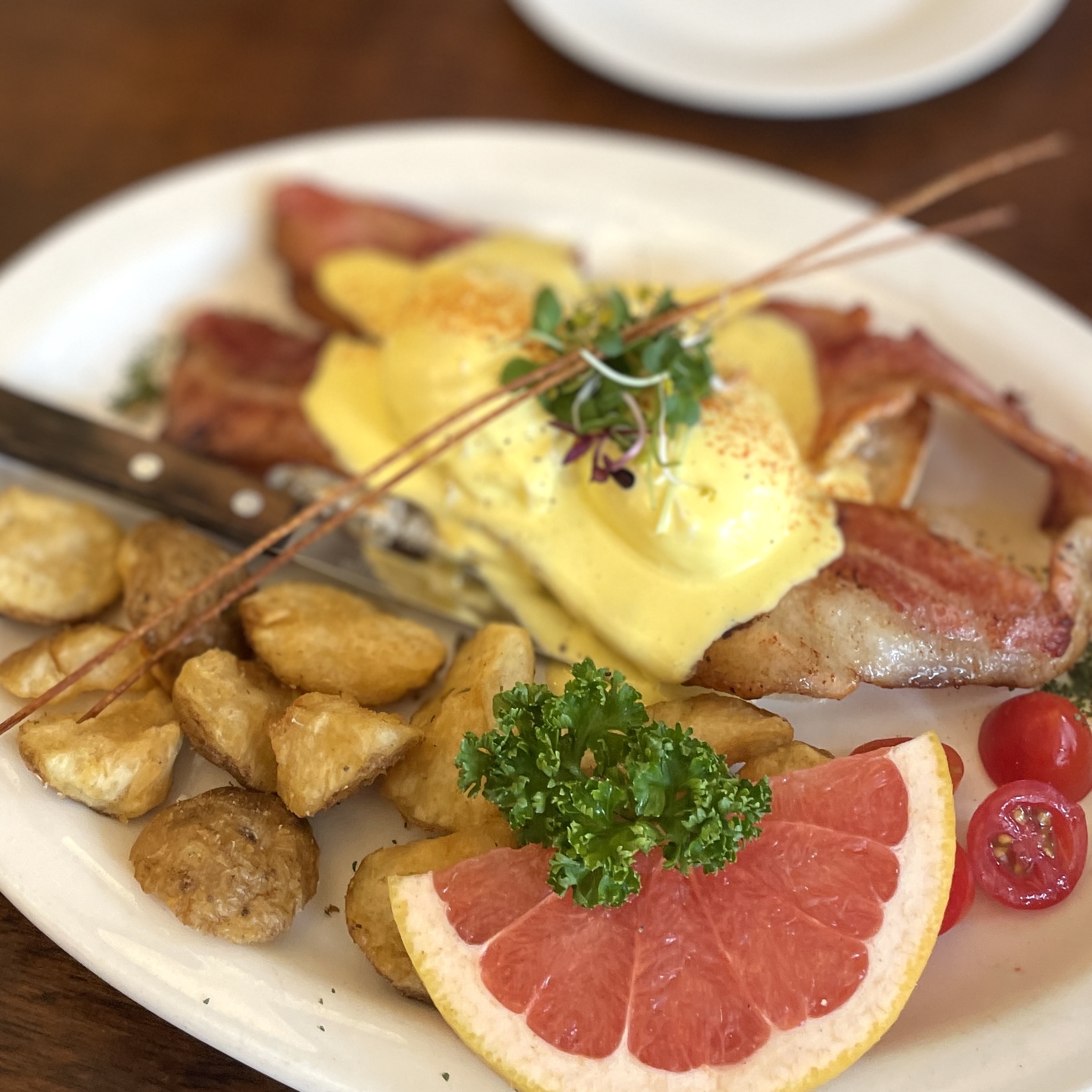 왼쪽부터 오버나잇 오트밀, 베이컨 에그 베네딕트, 더 피치스프링스. 오버나잇 오트밀은 사진으로는 딸기가 있길래 딸기 먹고 싶어서 시켰는데, 딸기가 제철이 아니라서 그런지 바나나랑 블루 베리 그리고 포도로 대체되어 있더라. 요거트에 오트밀 그리고 과일 조합이라 달짝지근하니 맛있을 줄 알았는데, 건강한 맛이더라. 그래도 다 먹긴 했다만 내 취향은 아니었다. 난 초딩 입맛이라 달아야 좋아해. 그 다음에 베이컨 에그 베네딕트는 베이컨과 에그, 자몽, 방울 토마토, 식빵 그리고 감자가 나오는데, 맛있긴 하다. 다만 감자가 좀 많아.