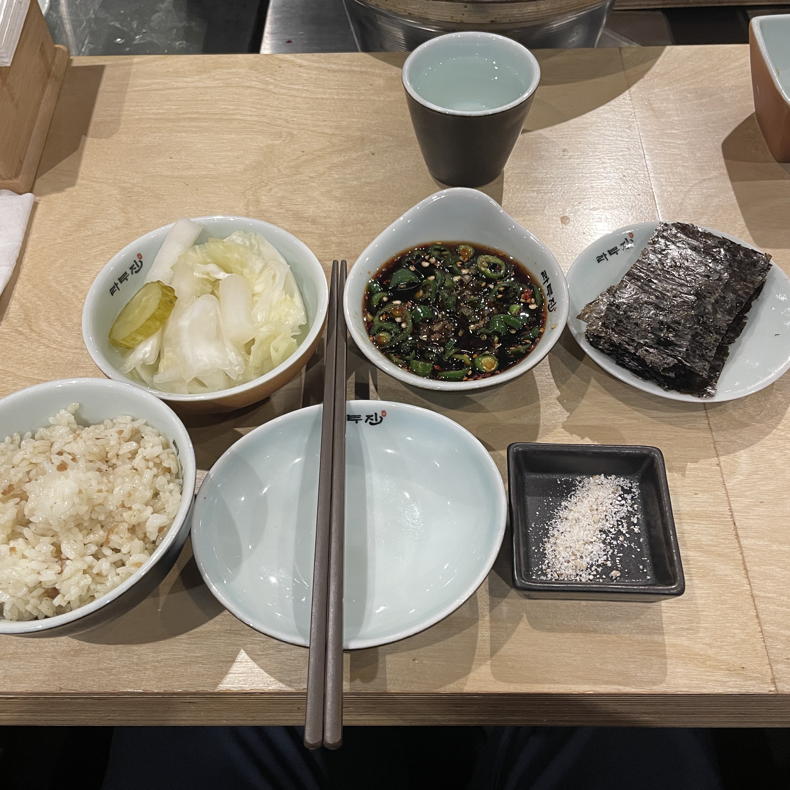 기본 셋팅. 마늘밥은 별도로 추가해야 한다. 마늘밥이라서 그런지 밥에서 마늘냄새 물씬 풍긴다. 마늘밥은 김에 싸서 간장에 찍어 먹는 거라는데, 그렇게 찍어먹어도 와 맛있다 뭐 그 정도는 아니고 쏘쏘했다. 다만 마늘밥이라서 그런지 젓가락으로 밥 뜨기가 조금 힘든? 잘 흐트러져.