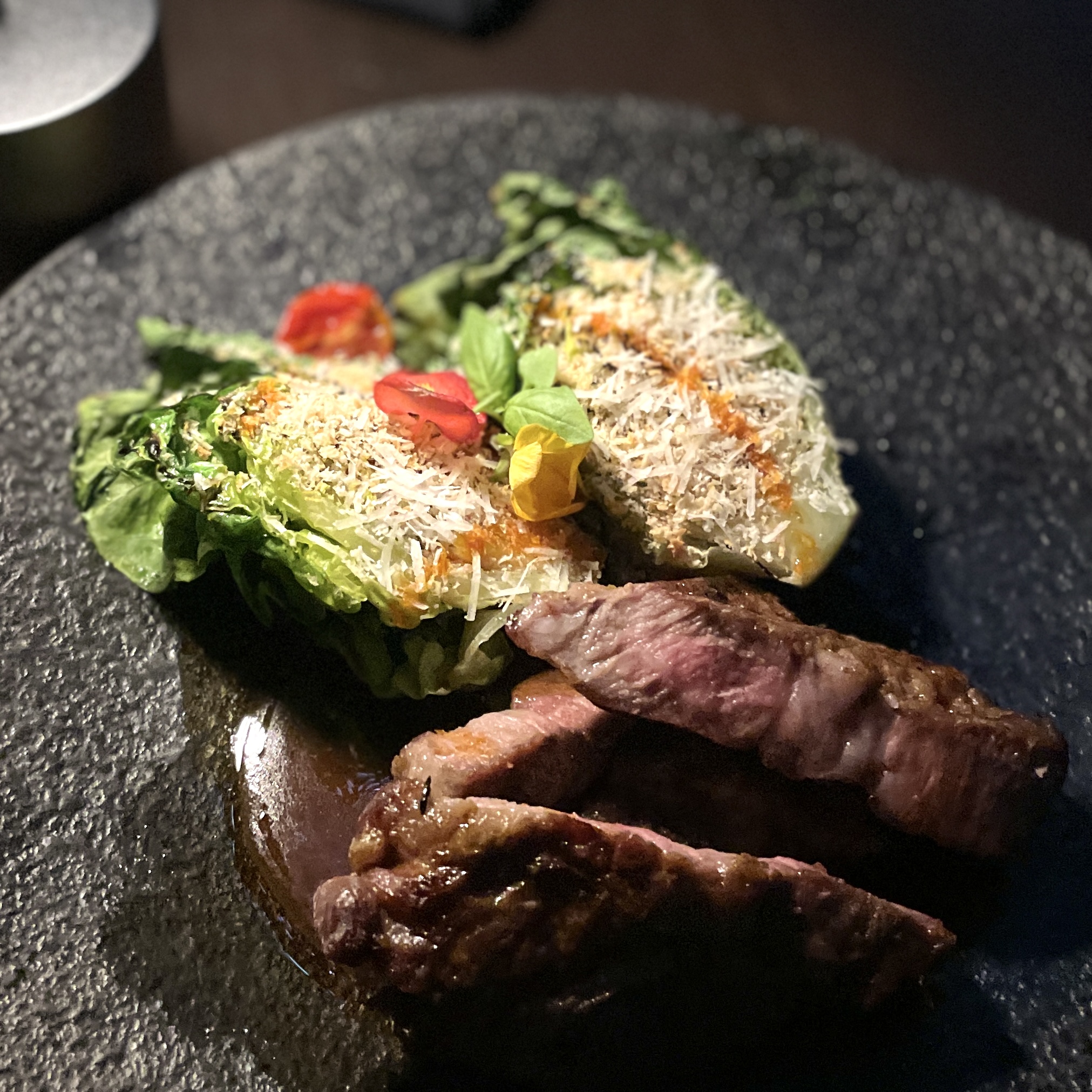 Iberico: 숯에 구운 이베리코, 미소 된장 베이스의 소스, 숯에 구운 양상추