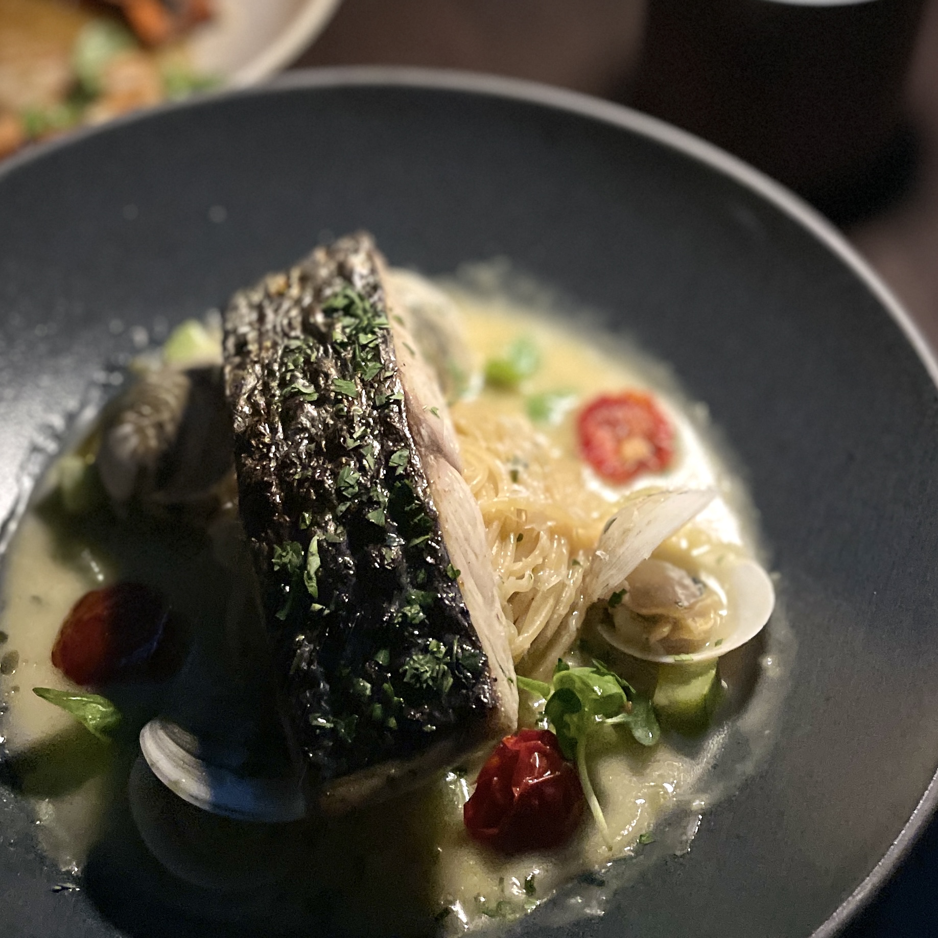 Sea Bream Pasta: 숯에 구운 도미에 모시조개를 곁들인 파스타