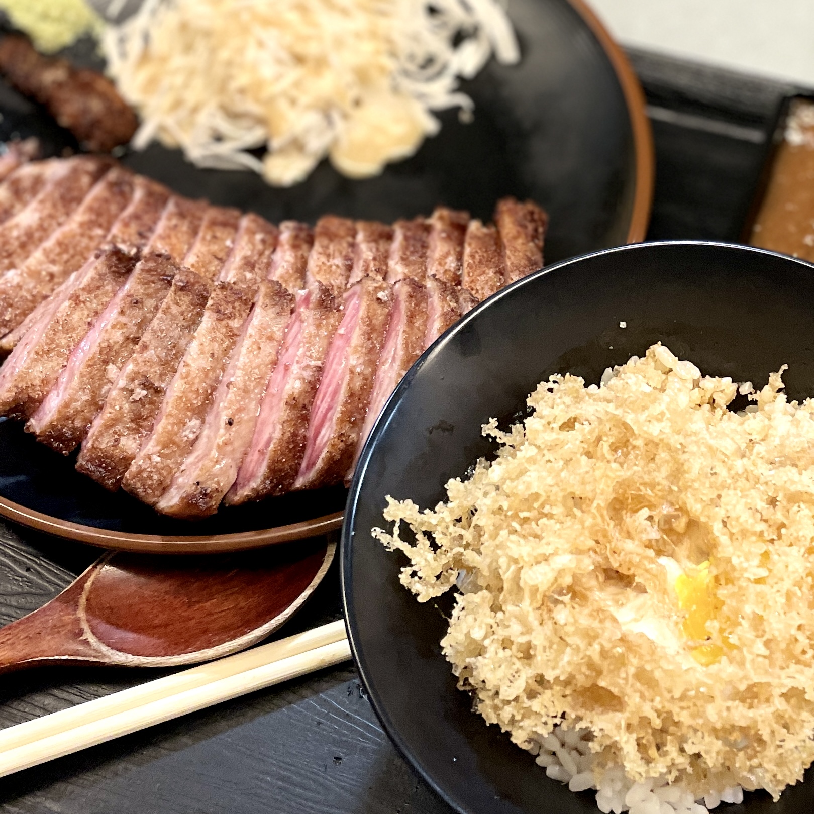 밥엔 밥 위에 반숙 계란과 튀김옷이 올라가 있는데 안에 간장이 뿌려져 있어서 비벼 먹으면 마치 어렸을 때 간장계란밥 먹던 느낌이다. 밥만 해도 맛있었고, 규카츠랑 같이 먹으니 더 맛있었고. 사진에는 장국이 빠졌지만 장국도 나오는데 장국은 그닥 내 취향은 아니더라는.