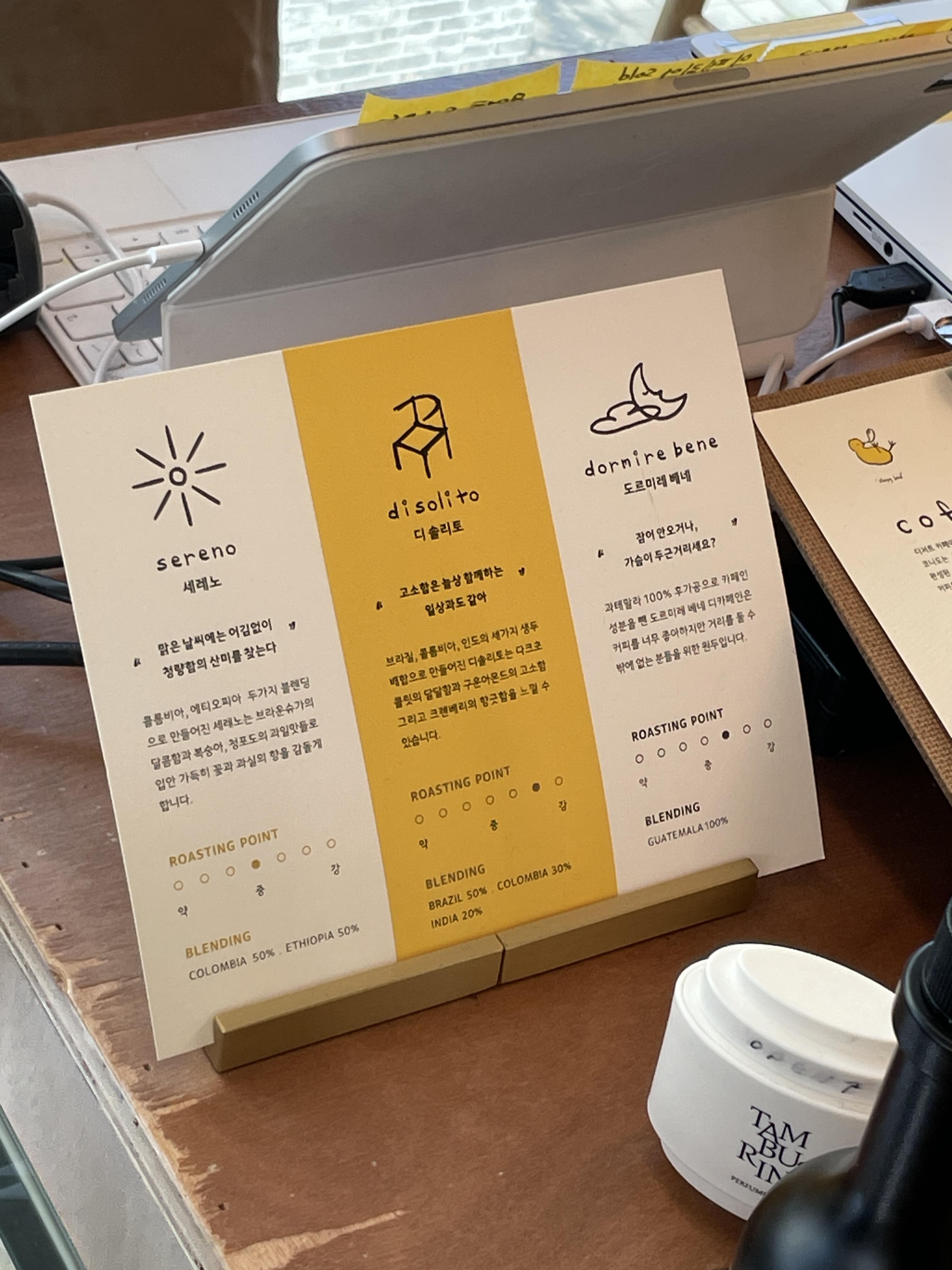 2층에 주문할 수 있고, 3층까지 테이블 있어서 이용하면 된다. 베이커리 종류도 좀 있는데 나는 이런 베이커리 그리 선호하는 편은 아닌지라. 나는 저렴하니 소보로 이런 거 좋아해. 저렴한 입맛. 그리고 여기는 아메리카노 시키면 원두 선택할 수 있다. 신맛, 고소한맛, 디카페인 중에서.