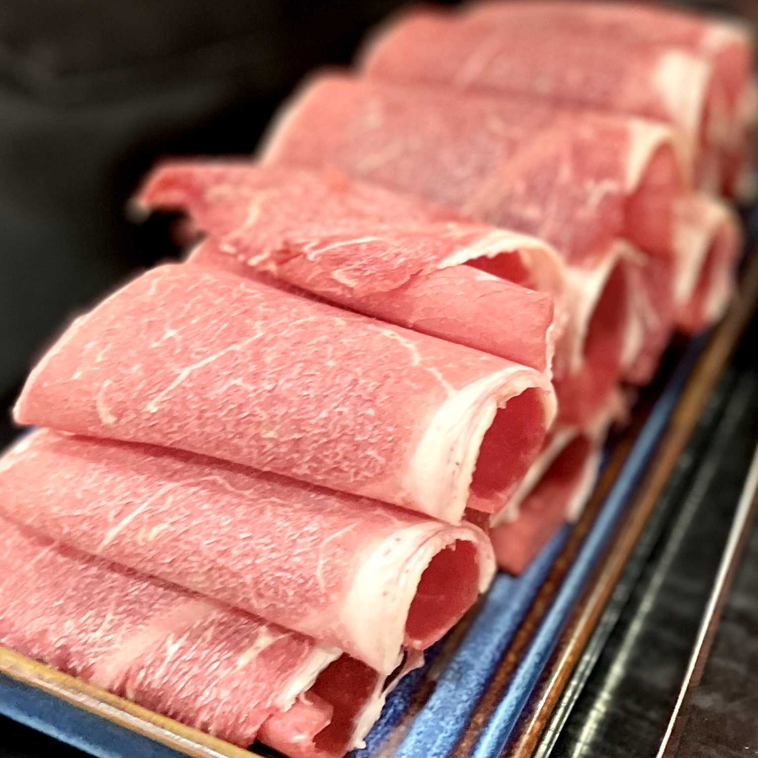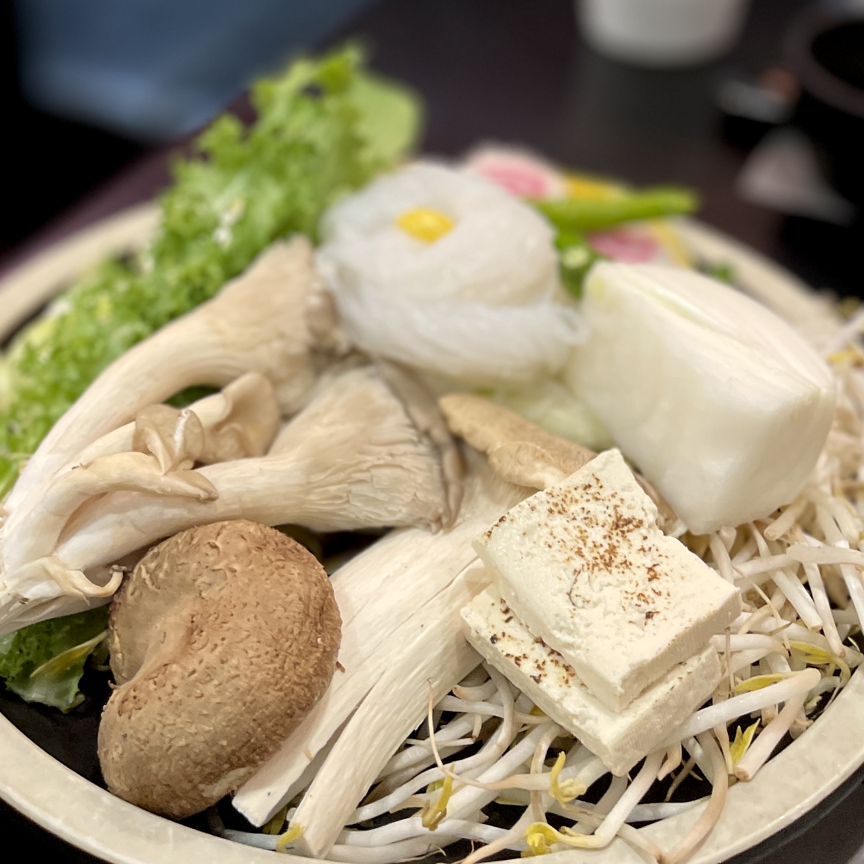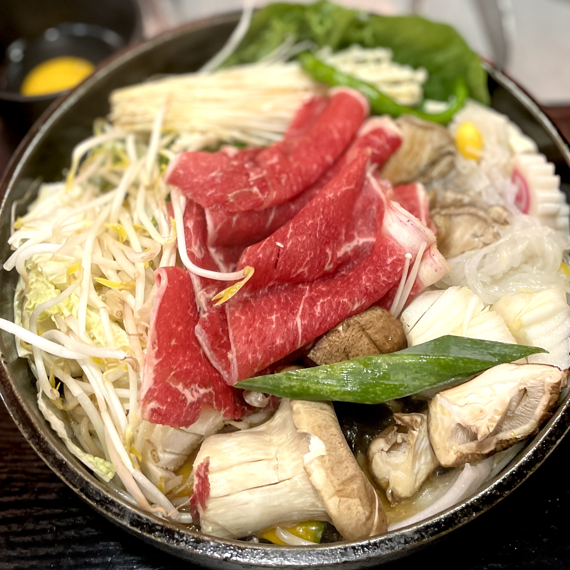 스키야키. 뭐 쉽게 얘기하면 일본식 샤브샤브라고 보면 된다. 그러나 샤브샤브랑은 좀 다른 게 샤브샤브는 국물에 소고기를 데쳐 먹는 식이면, 스키야키는 간장 육수에 익혀 먹는 식이라 샤브샤브 소고기보단 두껍다. 소고기는 미국산이고, 전각이랑 부채살 있던데, 우린 전각으로 시켰다.