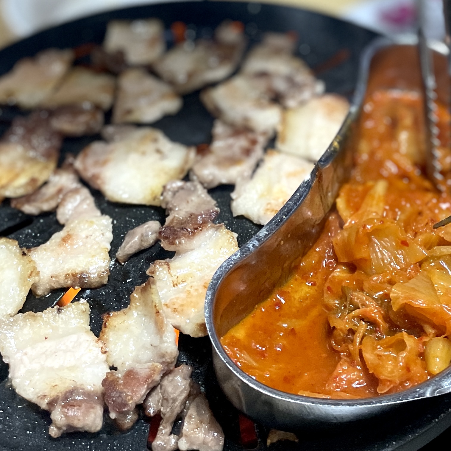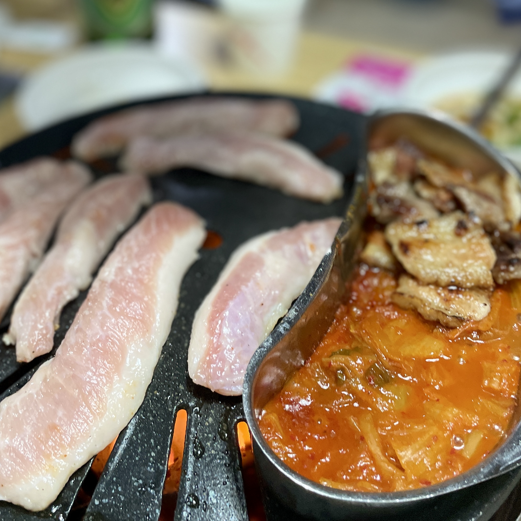 특수부위 지칭하는 4부위가 있다. 대망살, 눈꽃살, 가오리살, 모소리살. 4개 다 먹어봤는데, 그 중에서 추천한다면 대망살, 모소리살. 우선 대망살. 뽈살과 항정살이 합쳐진 부위인데, 고소하다. 보면 뭐 맛있겠나 싶지만 맛있다. 먹어봐. 그리고 다른 '동네 껍데기'도 그런 지는 모르겠지만 여기는 볶음 김치를 이렇게 담아줘서 불에 익혀서 고기와 같이 먹는데 정말 맛있다. 무한 리필이라는.
