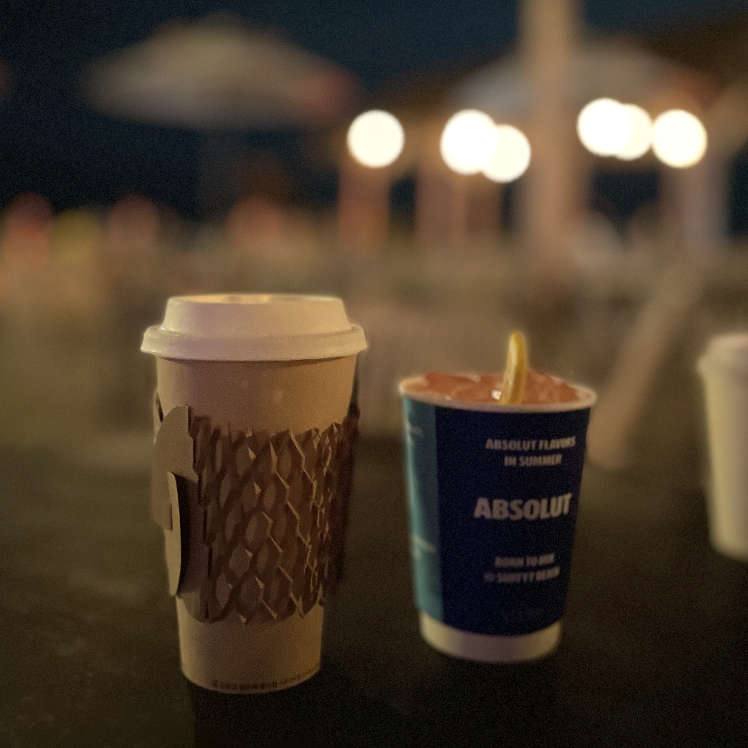 이런 데서는 보통 맥주를 마시곤 하는데, 요즈음 술이 잘 안 받아. 그래서 나는 라떼를 시켰는데 시럽 펌프질을 6번 정도 했나? 그렇게 하고 나오는데 넘어지면서 커피 쏟고 ㅎ
