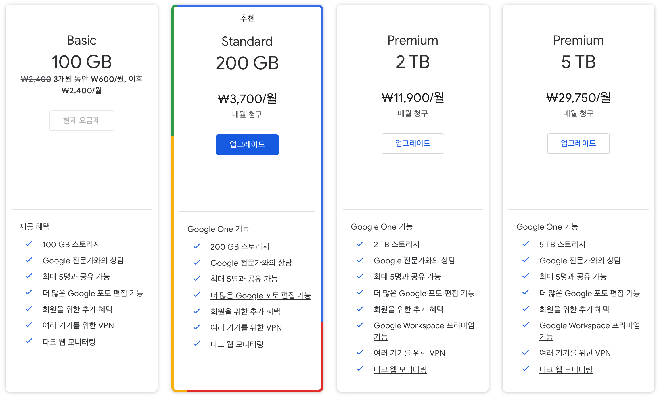 구글 드라이브는 내가 가장 주로 쓰는 백업 매체다. 물론 USB와 같은 데에 담아두고 다녀도 되지만 분실의 위험도 있고, 어디서든지 로그인만 하면 쓸 수 있기 때문에 지금까지 잘 사용했었지. 게다가 네이버 드라이브보다 용량도 훨씬 많이 주고. 15GB로 알고 있다. 근데 이제 그 용량을 초과한 거다. 그럴 수 밖에 없는 건 구글 포토 용량까지 합쳐져서 그런 것. 물론 용량 큰 거 USB에 별도 보관하면 될 문제지만 구글 포토의 기능들을 활용할 수가 없으니 그보다는 그냥 구글 드라이브 용량 업데이트하는 게 좋을 듯 싶었다.