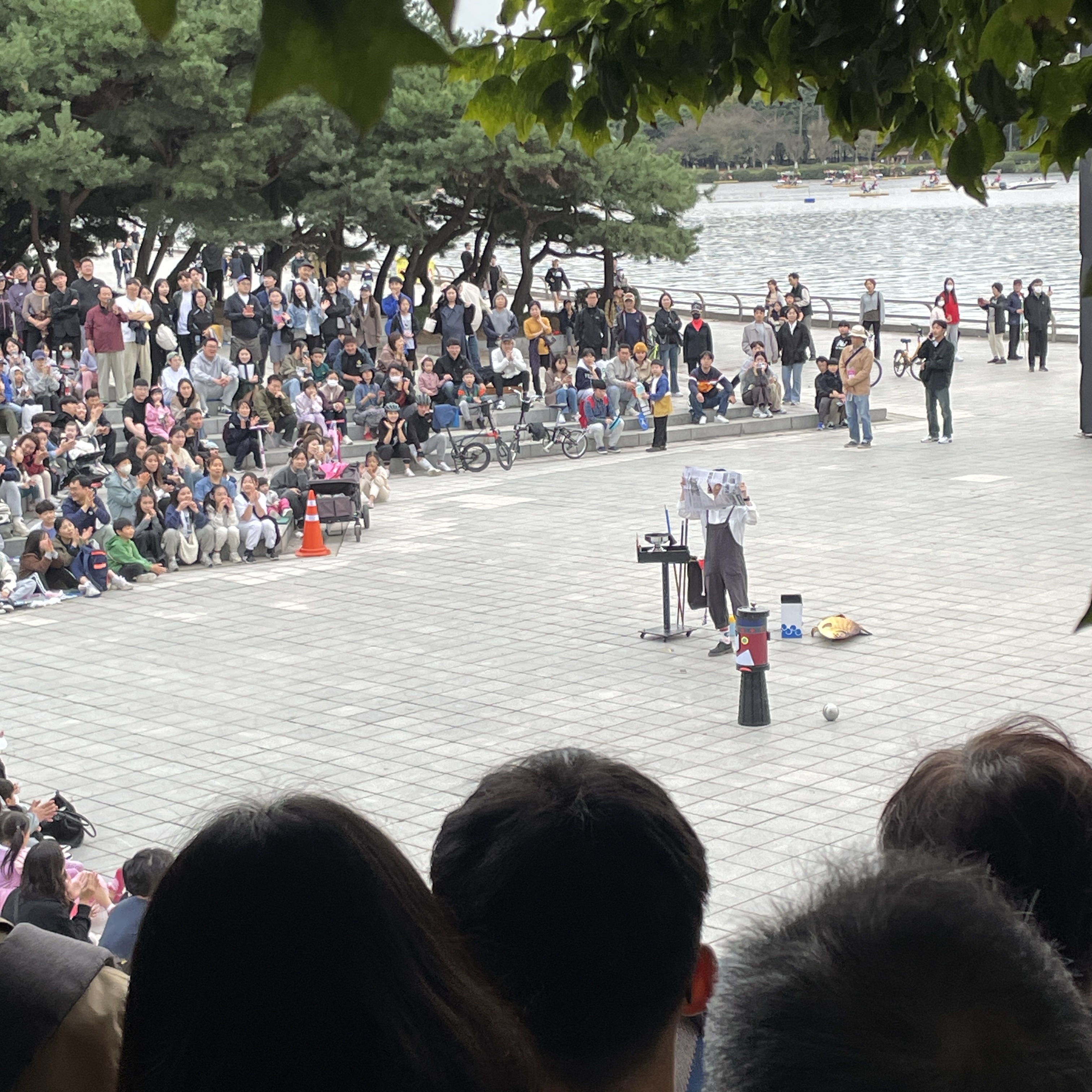 호수공원 거닐다 보면 원래는 곳곳에서 버스킹하는 친구들 특히 마술이나 마임 등이 많았는데 이제는 지정된 장소에서만 공연하는 걸로 바뀐 듯 싶다. 그래도 인기 많이 끄는 건 예술적인 거 보다는 아직까지는 재밌는 거 즉 마술 같은 거다. 관객들에게 웃음을 유발하고 참여를 유발하는 그런 공연. 아무래도 가족 단위로 오다 보니 애들이 많아서 애들이 볼 만해야 애들따라 부모들도 보게 되고 그러다 보니 많아지는 듯.