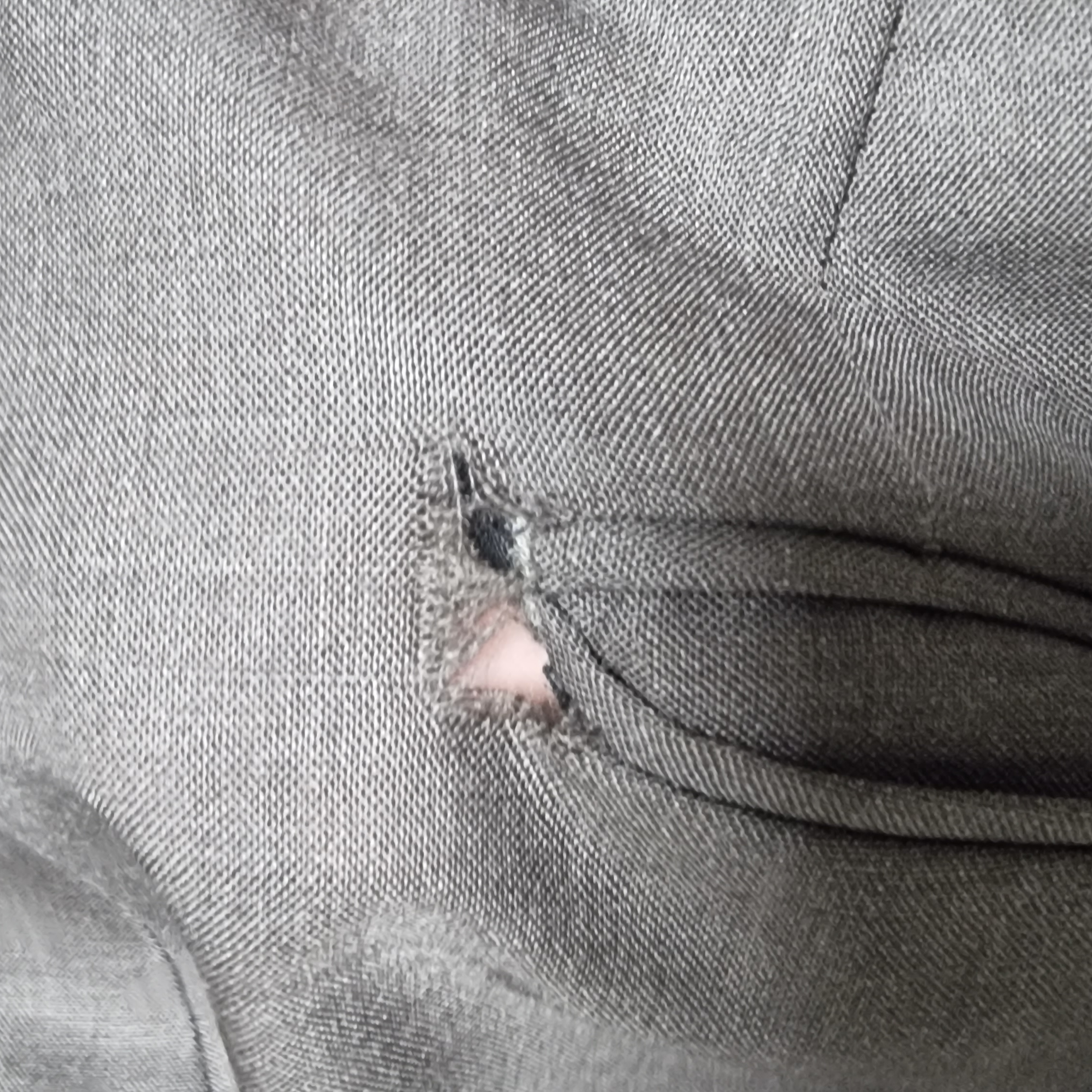 사진을 보내왔다. 헐. 많이 찢어졌네. 원단 자체가 찢어진 건 복구할 수가 없다. 이게 여름 바지였는데 여름 원단은 가벼워서(얇아서) 더 손상되기 쉽다. 어쩌다 이렇게 됐는지는 모르겠지만, 원단을 복구할 순 없고 짜깁기를 하려고 해도 참 애매하고. 그래서 이렇게 수선했다.