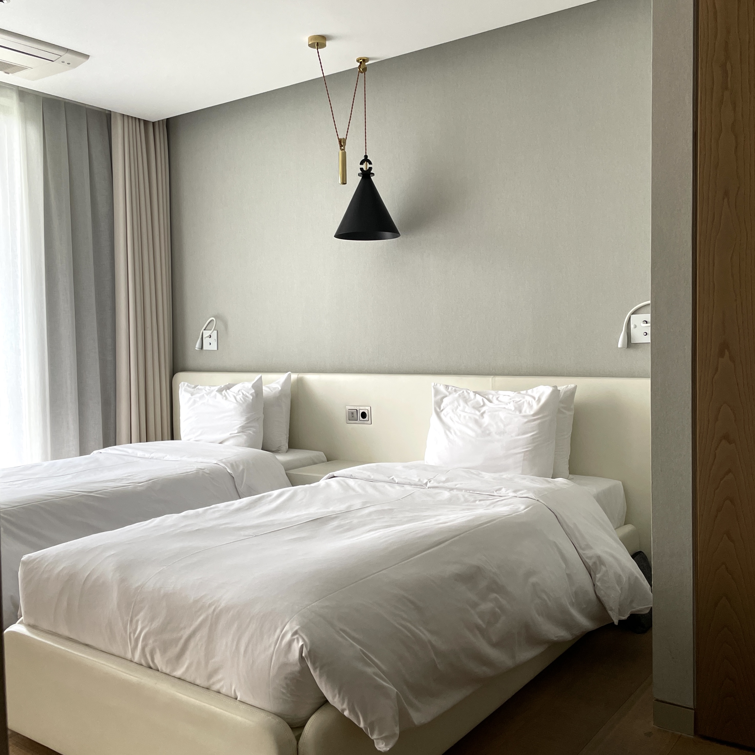 투 룸이다. 하나는 퀸 사이즈 침대 하나 있는 방이고, 다른 방에는 싱글 침대 두 개가 있는데, 각 방에 화장실은 별도로 다 있더라.