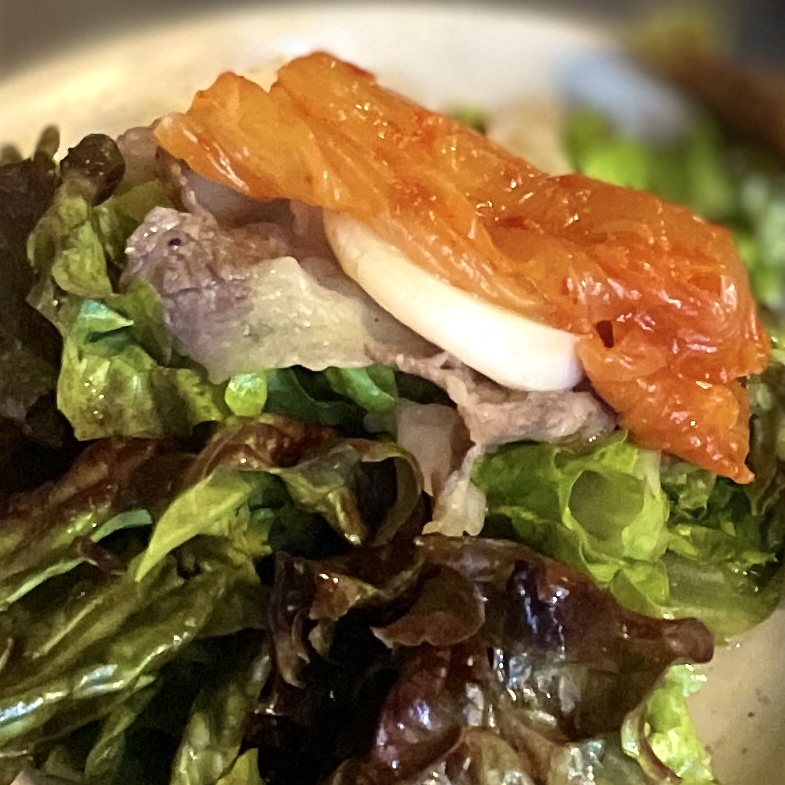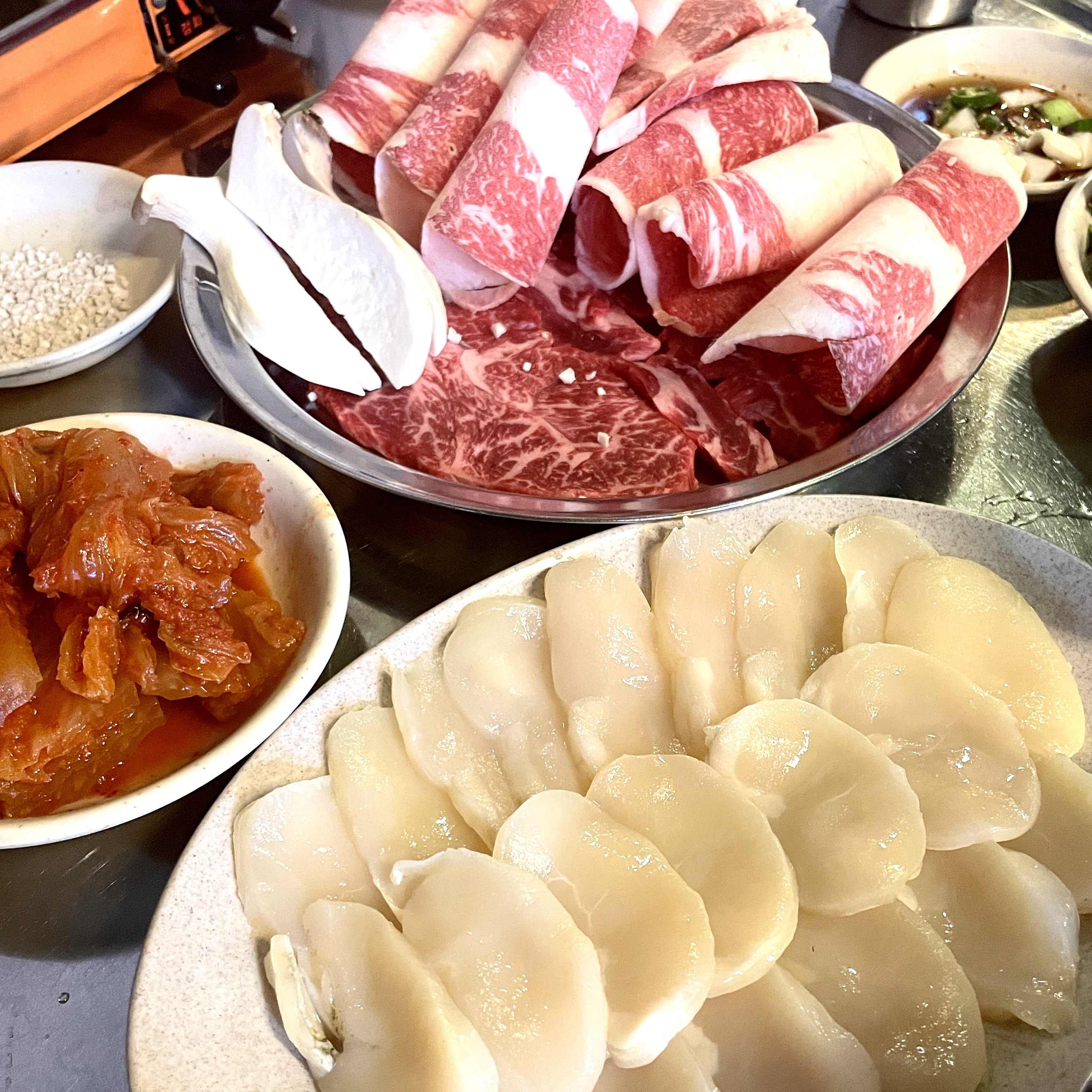 요거 이렇게 먹는 거다. 쌈 위에다가 묵은지, 차돌박이, 키조개관자 올려서 간장소스에 살짝 찍어 먹어보면 정말 맛있어.