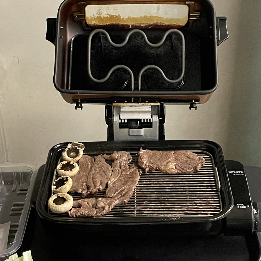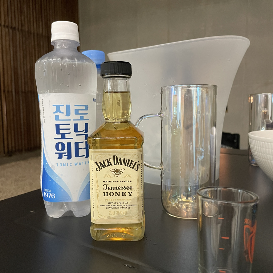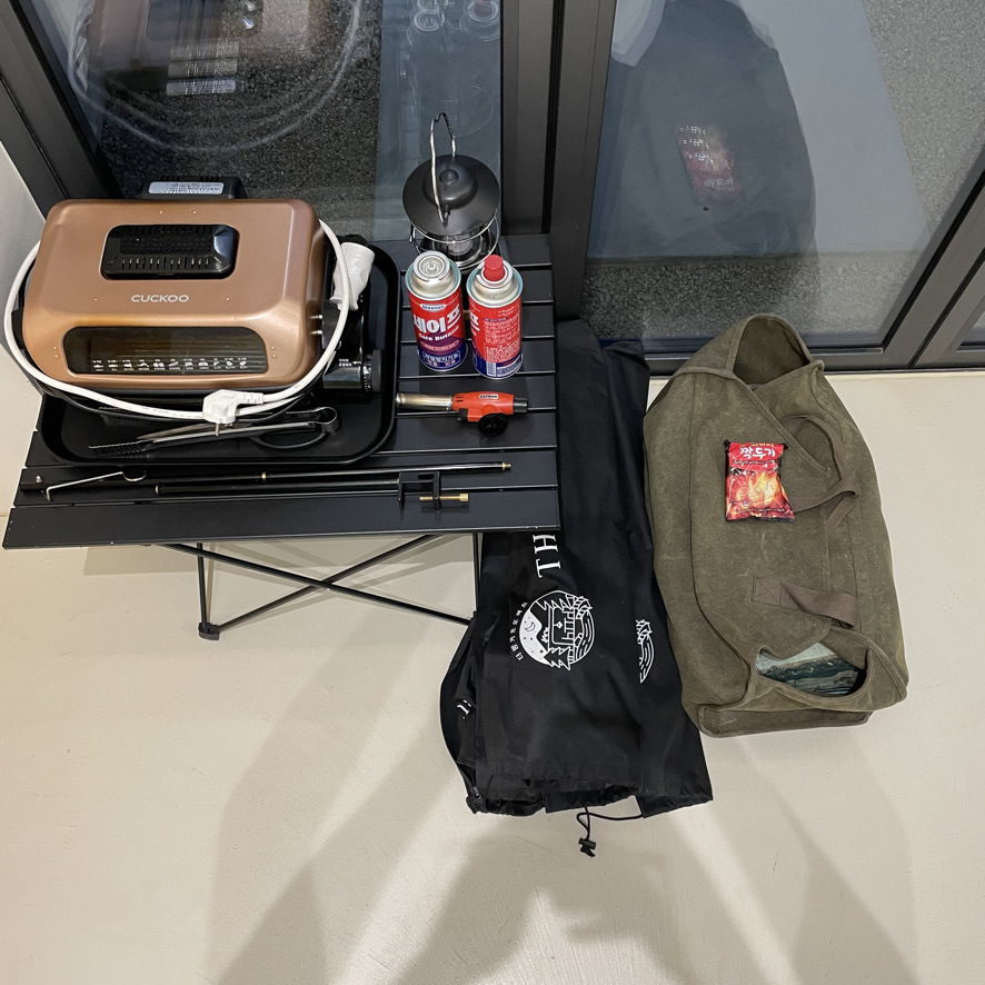마당에 테이블도 있지만, 콘센트도 있어서 펜션 내에 구비된 전기 그릴로 고기 구워먹었다. 하이볼도 타서 먹고.