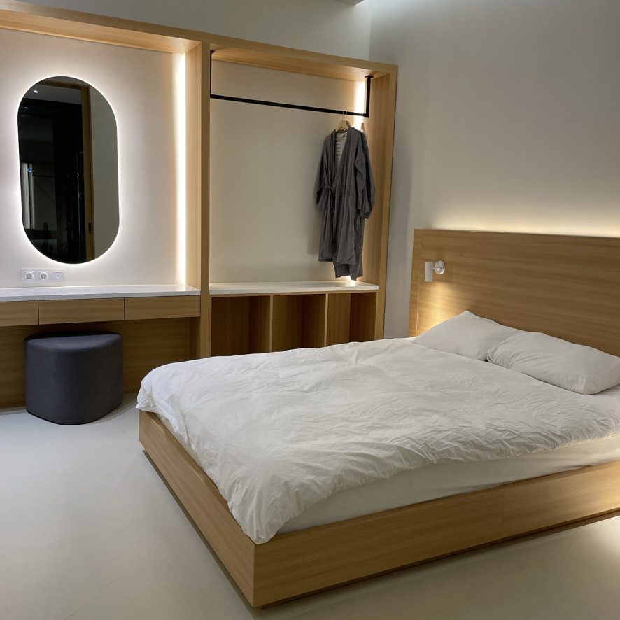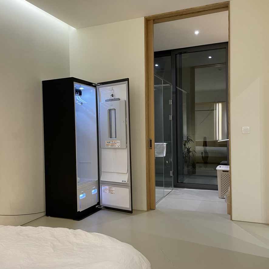 여긴 베드룸. 심플하고 전체적인 톤이 차분해서 좋다. 한켠에는 LG 스타일러가 있더라. 그리고 욕실로 이어지고, 욕실 옆에는 바로 대형 욕조가 똻! 그것도 바깥과 연결된 노천탕.