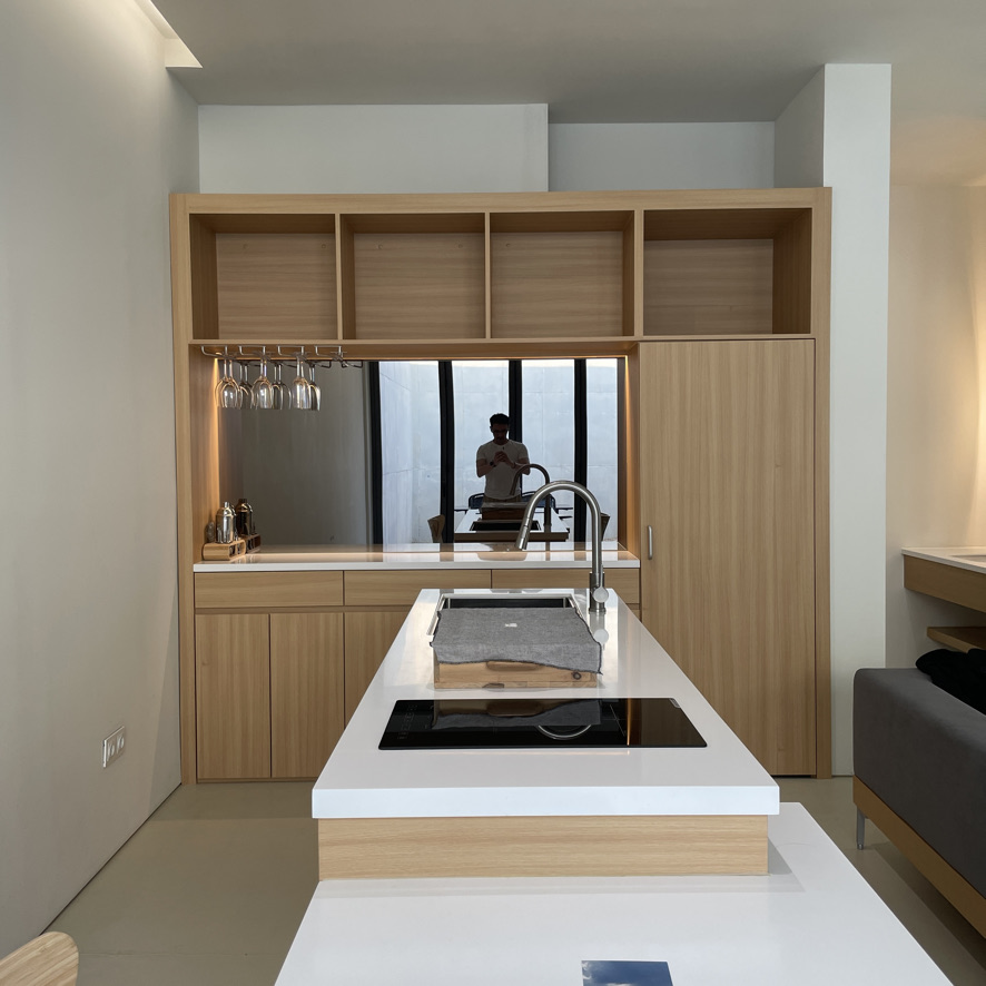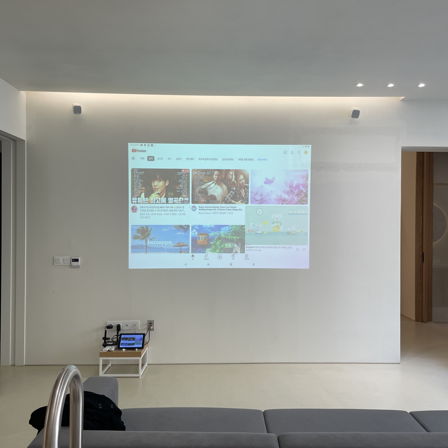 문 열고 들어가면 나오는 거실이다. 대형 TV가 아니라 빔 프로젝터를 흰 벽에 쏴주는데 이게 일장일단이 있다. 낮에는 화면이 좀 잘 안 보인다는 단점이. 그리고 거실 한켠엔 불멍 가능한 장비들이 있다. 시설도 시설이지만 즐길 거리가 제공된다는 거 중요하지. 뭐 힐링을 위해서 뷰 좋은 곳에서 아무 것도 안 하고 쉬고 싶다 하면 모르겠는데, 그런 게 아니라면 말이다. 그리고 뭘 해먹을 수 있는 시설이 구비되어 있어서 음식 해먹기 좋음.