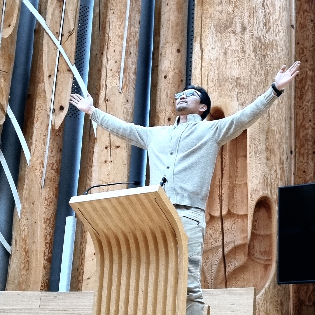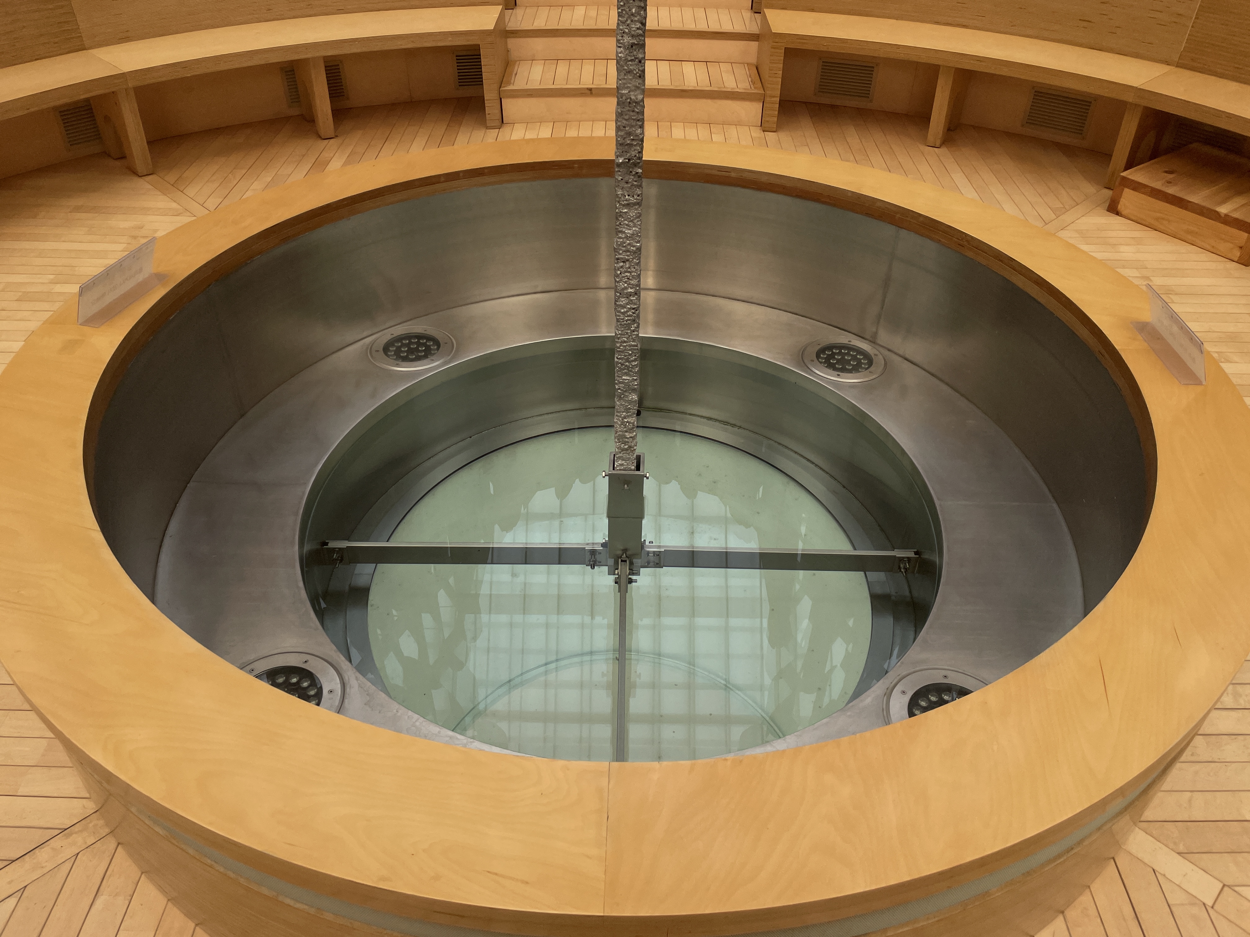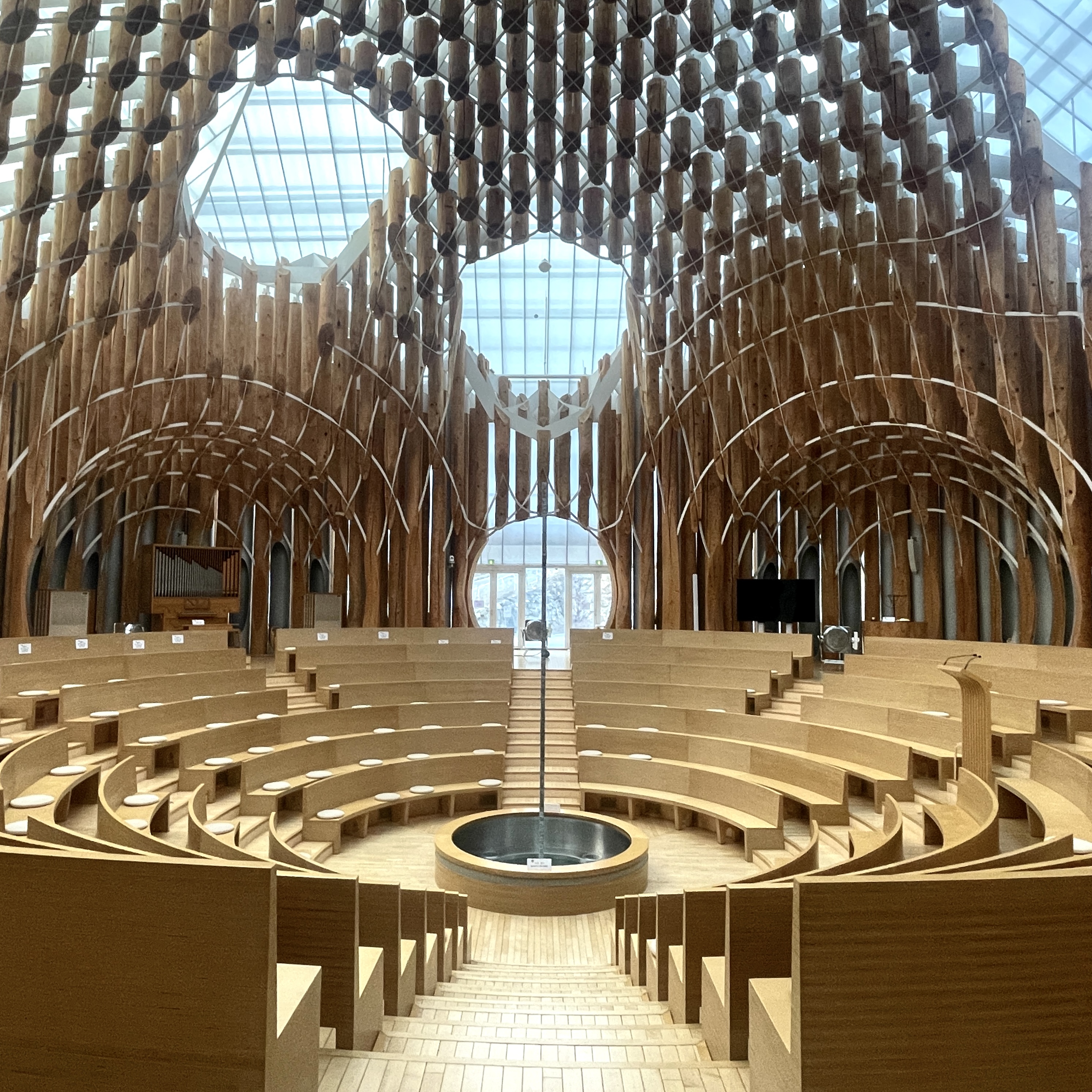 이게 예배실이다. 돔 형태로 좌석이 원형으로 되어 있다. 생각보다 그리 많은 인원을 수용할 수 없는 예배실이지만 천장에 통나무(홍송이라 한다)로 이렇게 해두니 뭔가 느낌이 색다르다. 게다가 어떤 부분은 창이 드러나 있어 이를 통해 빛이 들어와 내부가 어둡지 않게 해주고. 지금까지 교회하면 생각나는 예배실과는 사뭇 다른 느낌.
