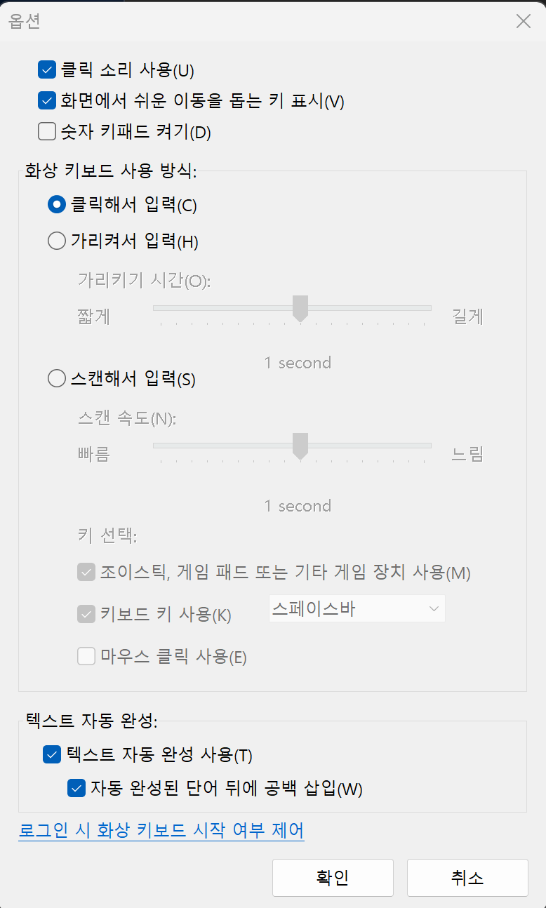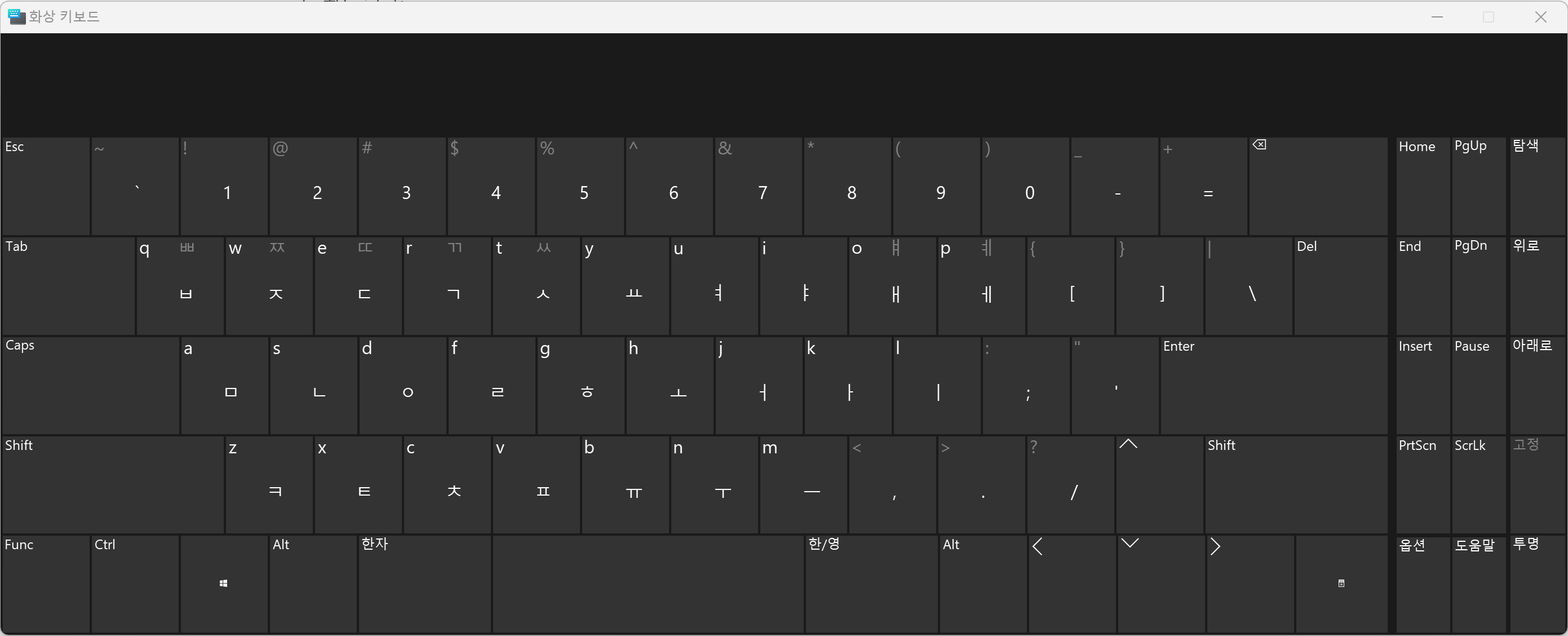 그러면 이런 화상 키보드가 뜬다. 일종의 가상 키보드인데, 어떠한 이유로 키보드를 입력할 수 없을 경우에 이걸 활용할 수 있다 이렇게 이해하면 될 듯. 여기서 오른쪽 아래에 '옵션'이라는 키가 있다. 이걸 클릭하면,