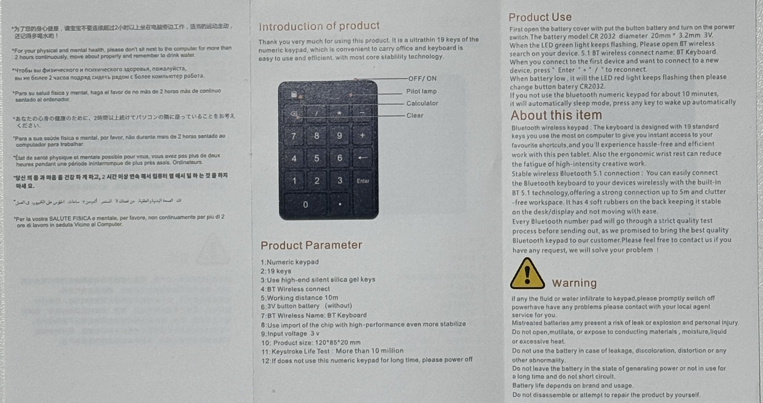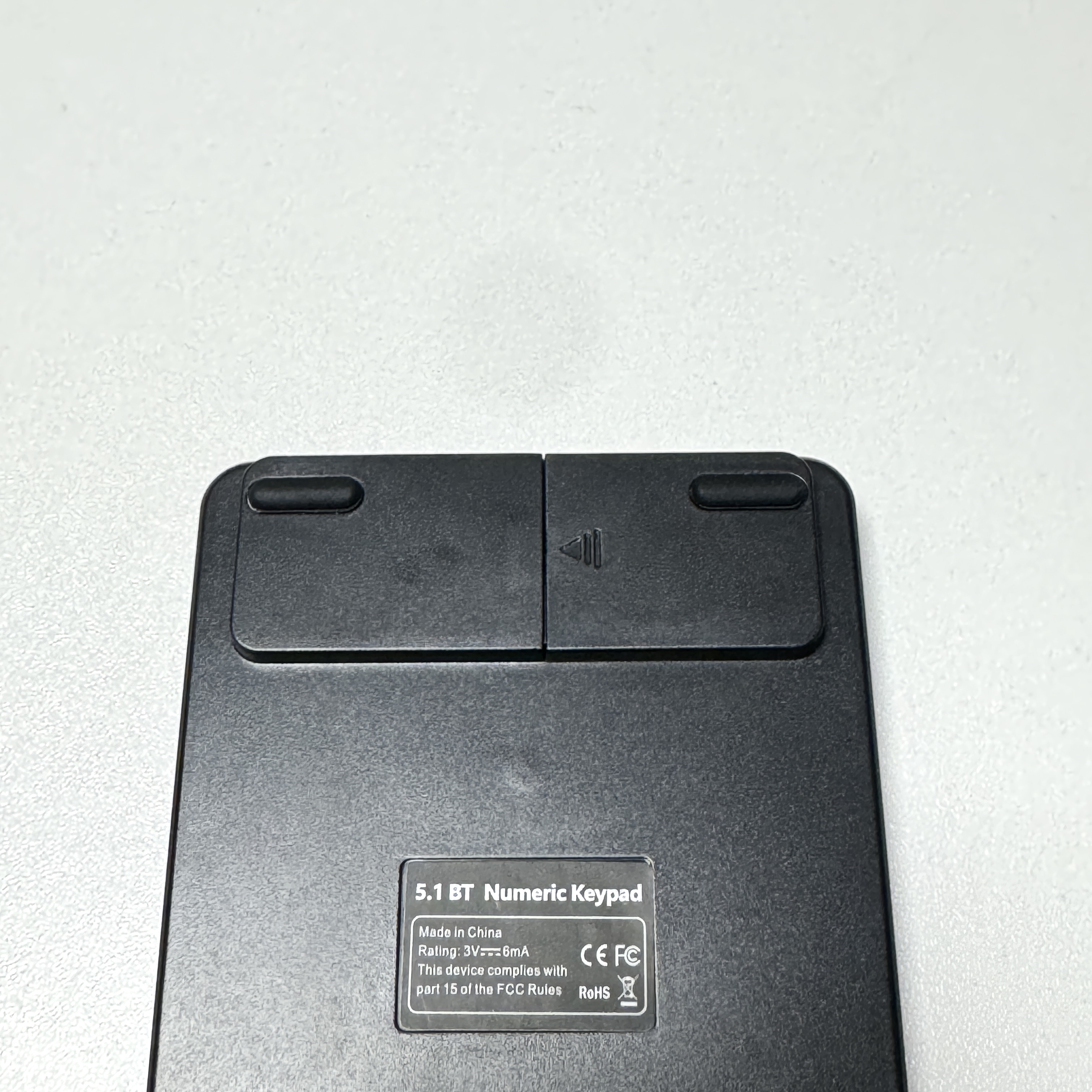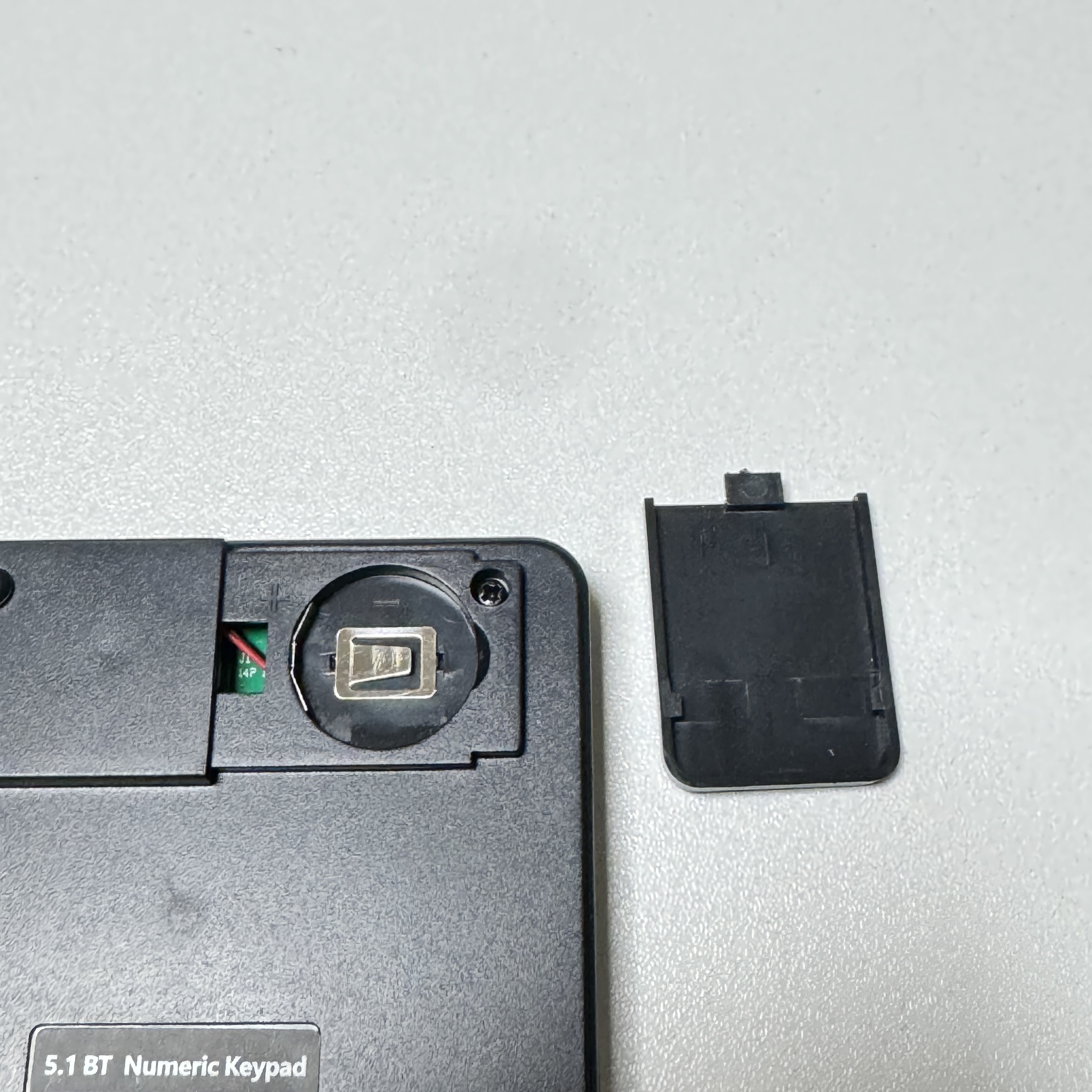 후면부에는 고무 팁이 있어서 흔들리지 않게 고정해준다. 그렇다고 키패드 각도를 조절할 수 있게는 안 되어 있더라. 그냥 편평하게 놓고 입력해야 된다는. 이런 거는 사실 나에겐 큰 문제 아니다. 보통 랩탑 쓰는 사람들은 랩탑 거치대나 스탠드 주로 사용하는데, 이건 랩탑에 키보드 연결해서(랩탑 키보드가 좁은 편이니) 사용하는 경우가 많아서인데, 나는 그냥 랩탑의 키보드 쓴다. 나는 이것 저것 주렁주렁 달고 다니는 거 별로 안 좋아해서. 동전 배터리는 CR2032 배터리더라.