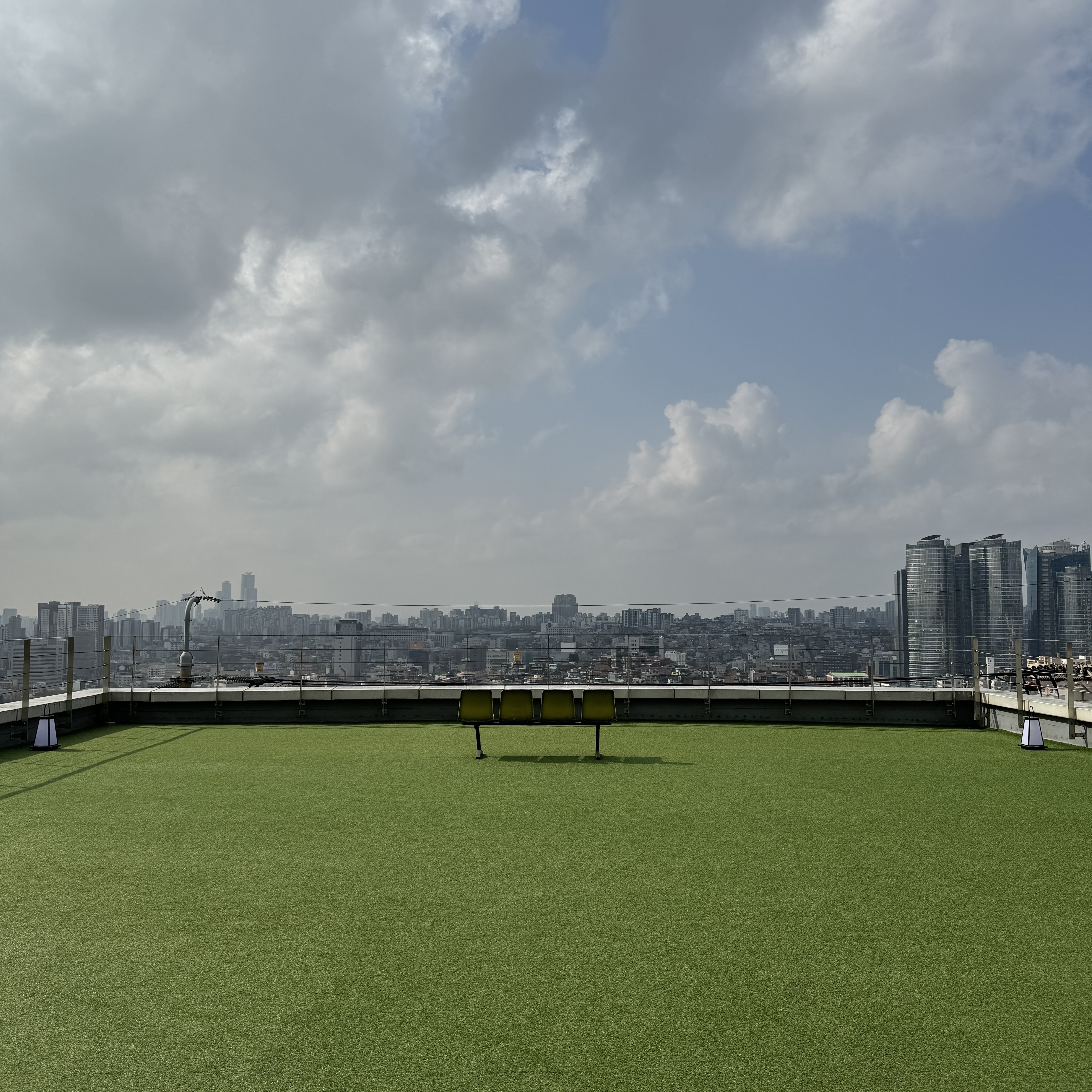 옥상이다. 인조 잔디가 깔려 있어서 여기서도 커피 즐기면 좋을 듯 싶은데, 겨울이다 보니 여기에 테이블 같은 거를 없앤 게 아닌가 싶다. 아마 여름이면 테이블 설치되어 있을 듯. 중간에 덩그러니 4인용 의자가 하나 있다. 끝에 가서 보는 뷰는 뭐 그냥 시티 뷰인데 그리 멋지진 않아. 그래도 앞에 높은 건물이 없다 보니 바람이 불어와서 시원(?)하긴 하더라.
