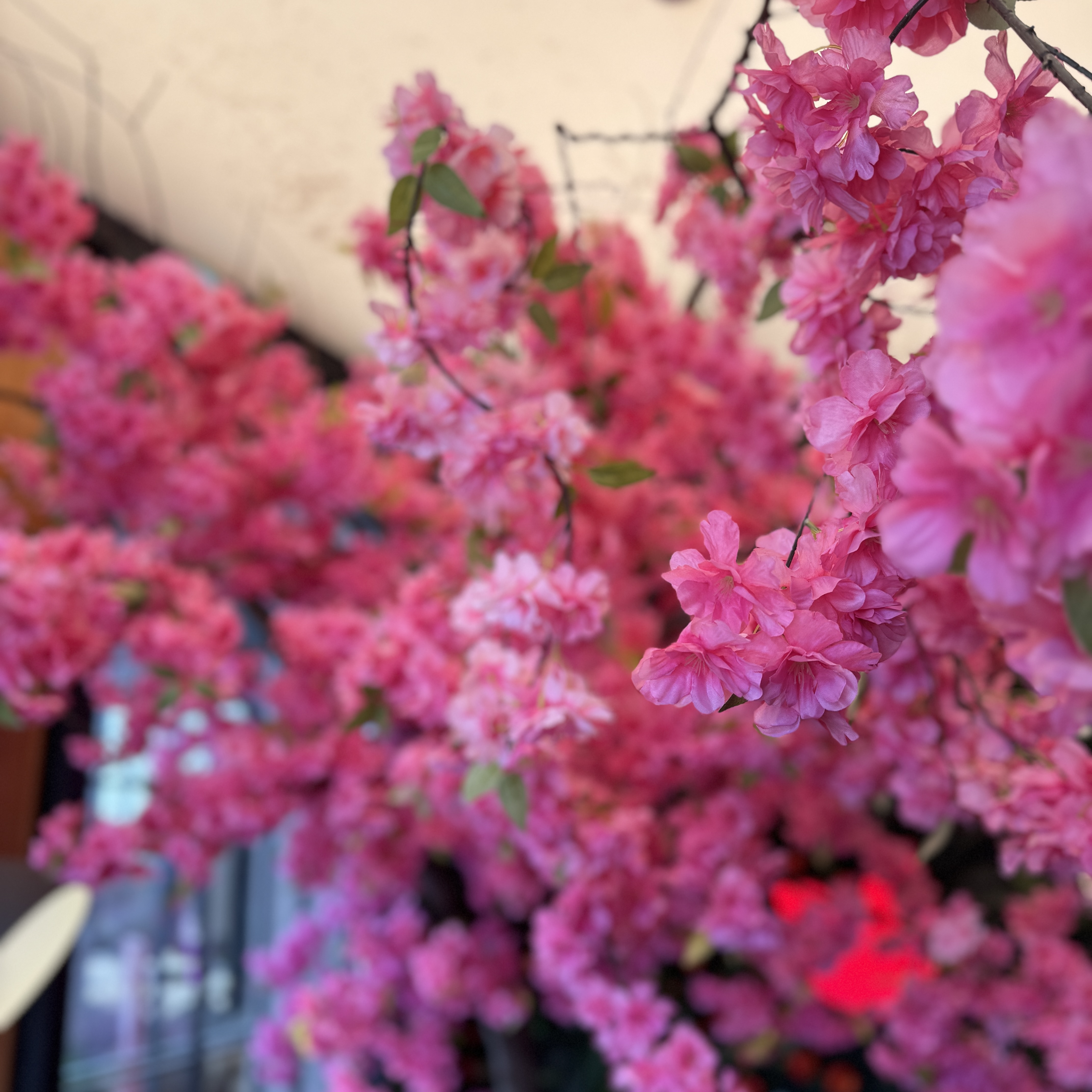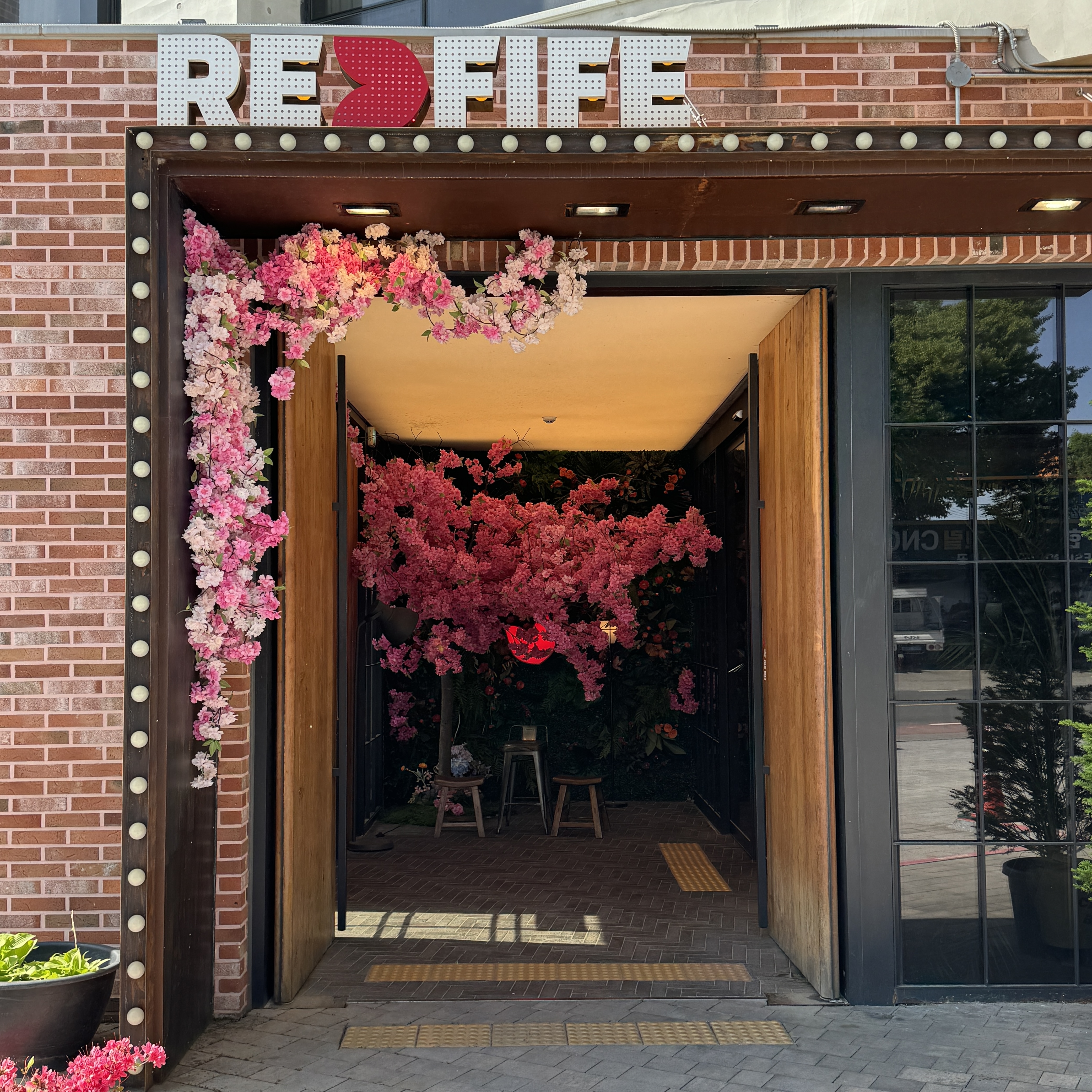 서울에서 대형 카페를 만들기 쉽지 않은 게 카페 건물만 생각해서 될 게 아니라 그 많은 인원이 가져올 차량을 주차할 수 있는 공간까지 있어야 한다는 걸 꺼다. 여기 주차장 넉넉하다. 입구에는 이름 모를 분홍꽃이 있는데, 첨엔 벚꽃인 줄 알았는데 아니더라는. 뭔지는 모르지만 생화가 아니라 조화다. 예전에 지인이 카페 만든다고 이런 거 셋팅한 적 있는데 하루 종일 꽂꽂이했던 기억 나네. ㅎ