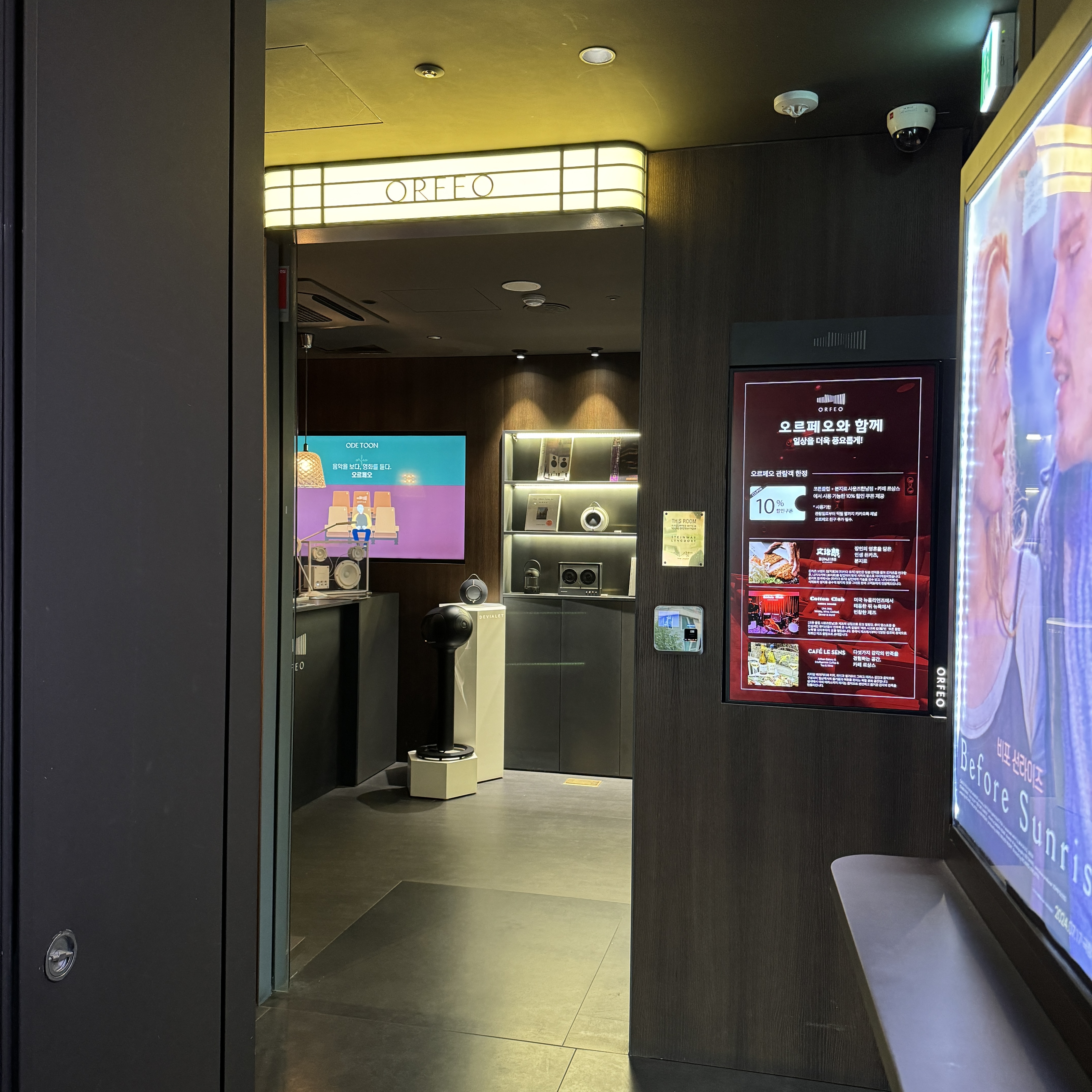 오르페오는 예약제다. 카카오톡 채널을 추가해서 예약하고 결제는 현장에서 했다. 인당 25,000원. 영화관보다 가격이 더 비싸지만 그래도 이런 경험도 한 번 해본다 생각하면(사운드가 좋은 건 전혀 모르겠고) 이용해보길. 영화관은 조그맣다. 6명이 한 줄, 총 5줄이니까 30명이 관람 가능한 규모라 영상도 그리 크지 않다. 앞좌석하면 고개가 아프지 않을까 싶긴 했는데 2번째 줄에 앉았는데도 전혀 그런 느낌이 안 들더라. 그냥 집에서 프로젝터로 보는 느낌?