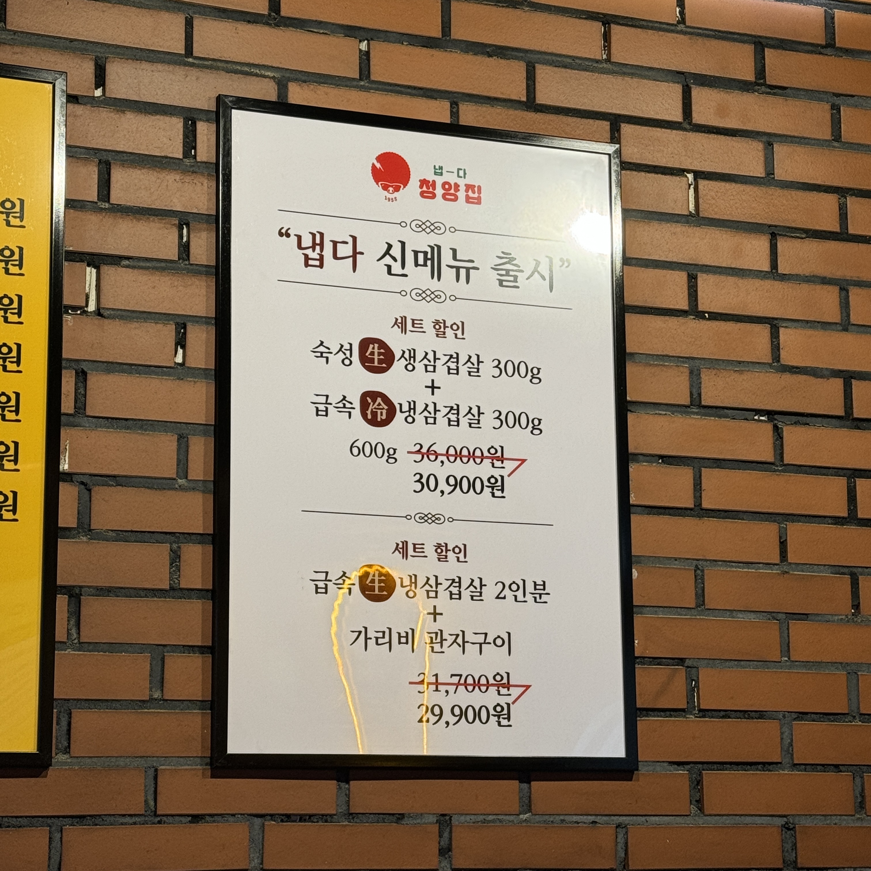 노원역 근처에서 뭘 먹을까 하다가 냉동삼겹살 맛있다고 해서 찾은 냅다 청양집. 알고 보니 프랜차이즈더라. 사실 냉동삼겹살이 어지간하면 맛없을 수가 없는데, 내가 지금까지 먹어본 냉동삼겹살 중에 최고는 성수동에 있는 잠수교집이고, 제일 맛없던 데는 일산에 있는 임창정 세겹살이었다. 성수동에 있는 잠수교집은 고기가 좋아. 먹어보면 확실히 다르다는 걸 알 수 있다는. 과연 여기도 그럴까 싶었는데, 고기 질은 비할 바는 안 되지만 메뉴 구성이 참 맘에 들더라.