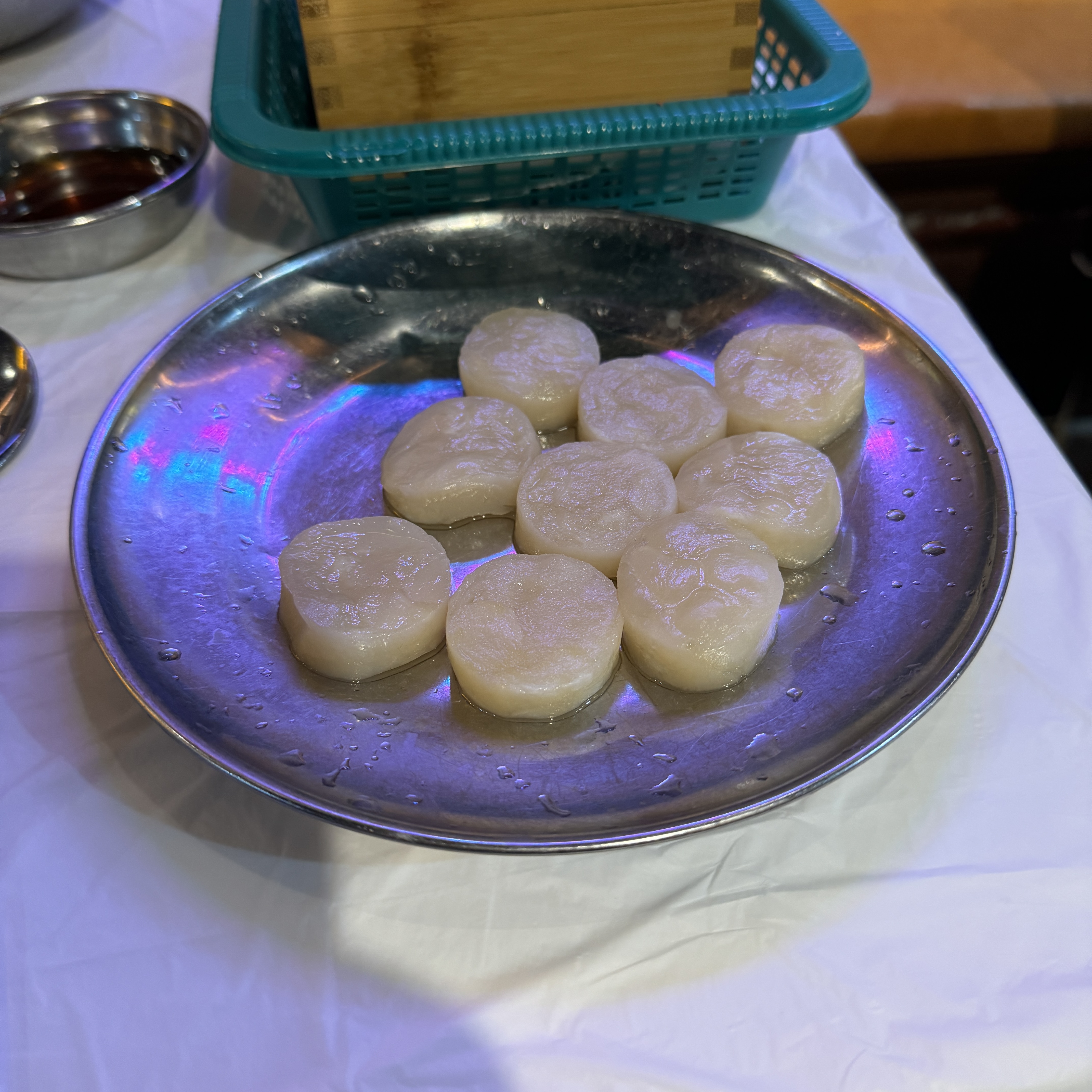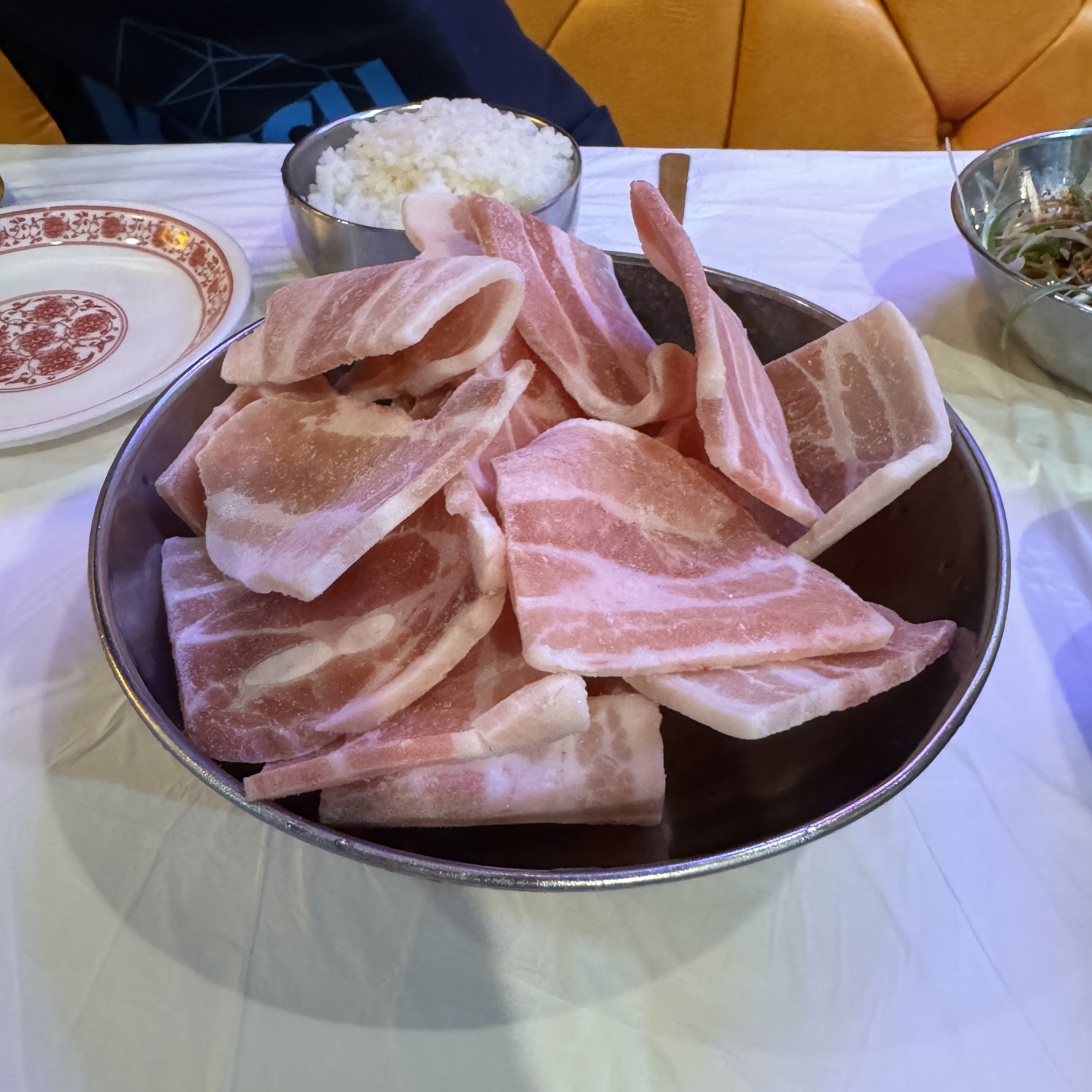 메뉴 중에 세트 메뉴가 있어서 급속 생 냉삼겹살 2인분 + 가리비 관자구이 시켰다. 거기에 영구기찌개(된장+청국장) 시키고. 공기밥 두 개. 공기밥이 희한하게 1,000원이 아니라 900원이다. ㅎ