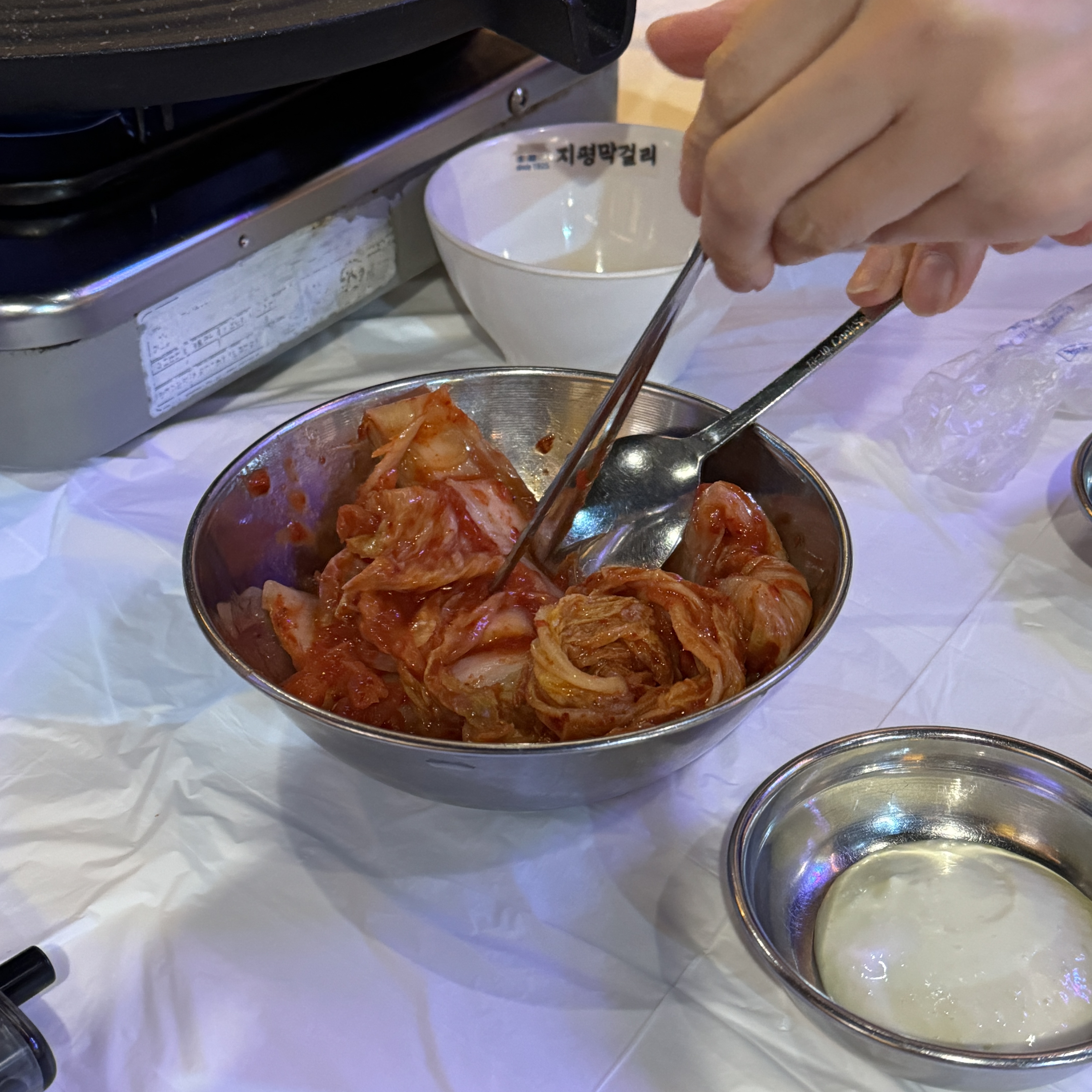 영구기찌개. 이건 된장찌개랑 청국장찌개랑 합친 건데, 첨 봤다. 근데 괜찮아. 한 번 먹어보길 추천. 그리고 김치 맛있었고. 김치 맛있으면 나는 밥 한 공기 뚝딱하는데, 이 날은 김치 구워서 삼겹살이랑 같이 먹는다고 김치만 따로 먹지 않았네.