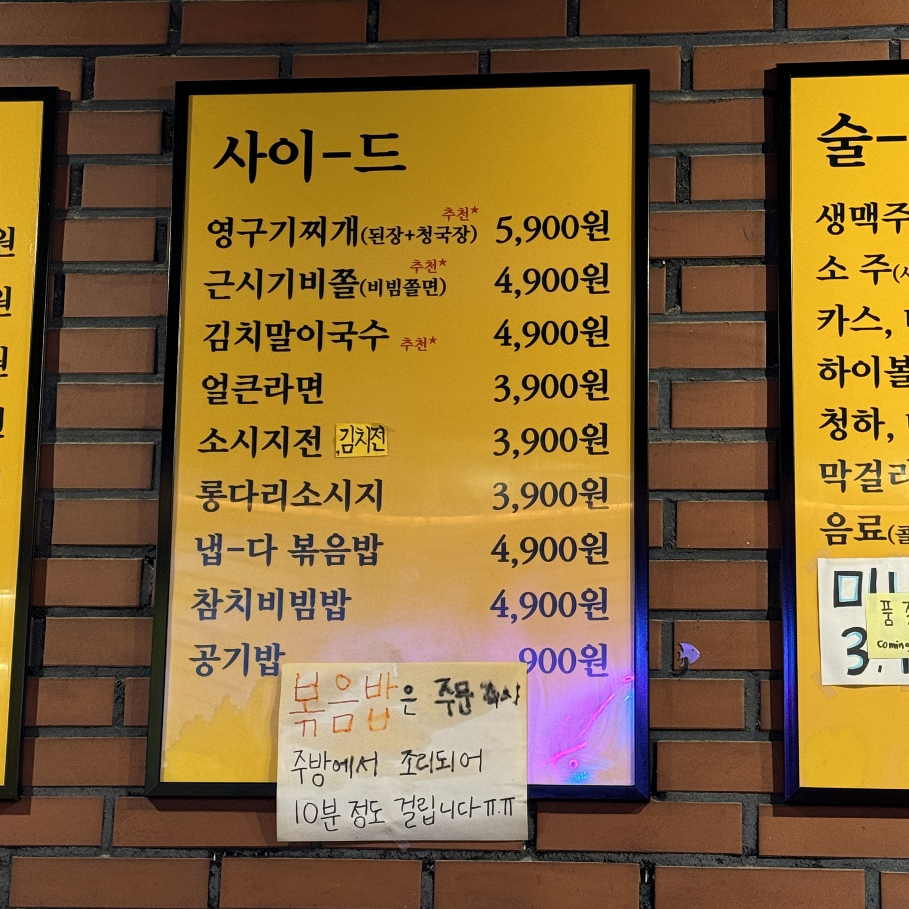 프랜차이즈라 이곳 저곳에 있을 거라 보지만, 왠만해서는 실패하지 않는 냉동삼겹살에 다른 데서는 볼 수 없는 영구기찌개. 그리고 저렴한 가격 생각하면 추천할 만하다 본다.
