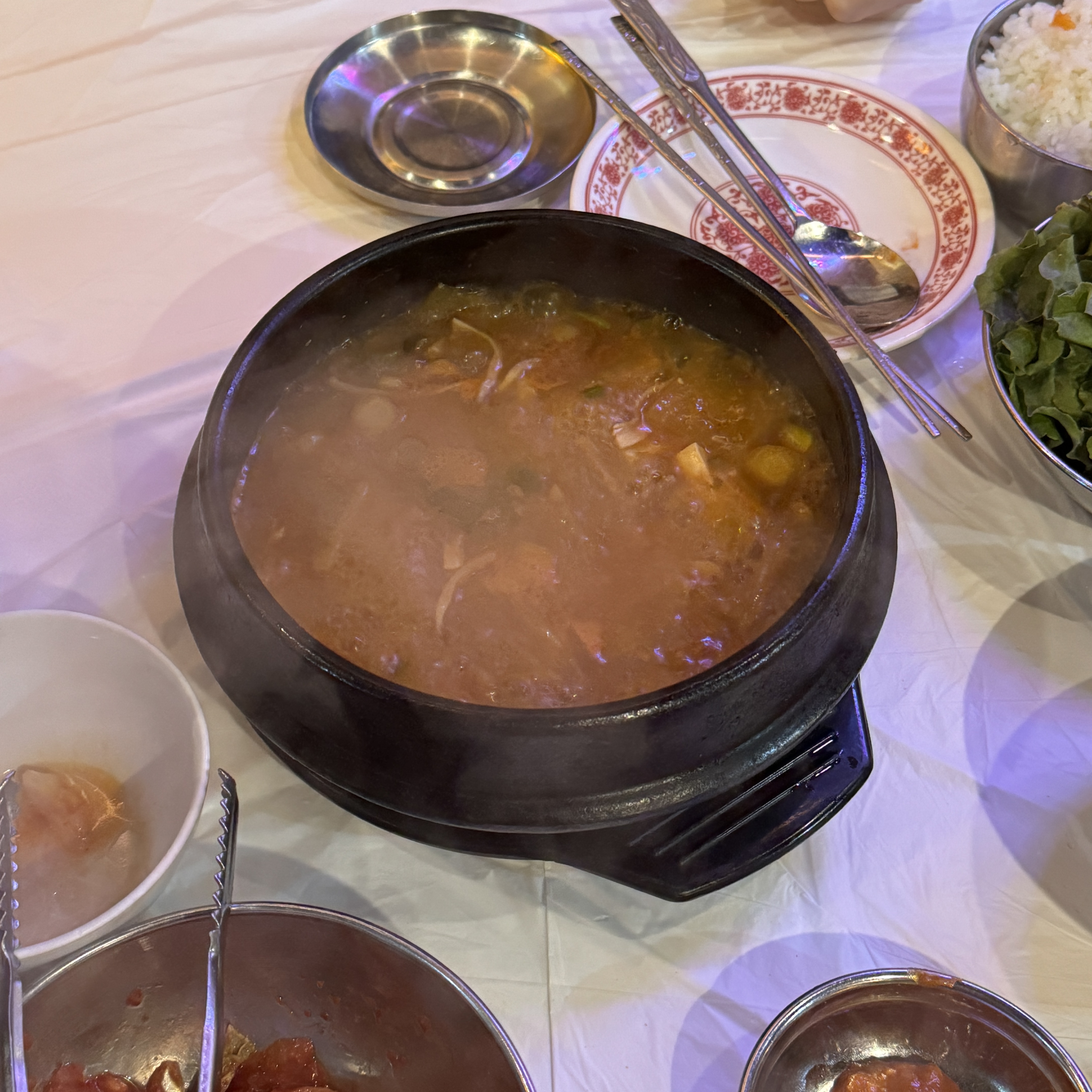 영구기찌개. 이건 된장찌개랑 청국장찌개랑 합친 건데, 첨 봤다. 근데 괜찮아. 한 번 먹어보길 추천. 그리고 김치 맛있었고. 김치 맛있으면 나는 밥 한 공기 뚝딱하는데, 이 날은 김치 구워서 삼겹살이랑 같이 먹는다고 김치만 따로 먹지 않았네.