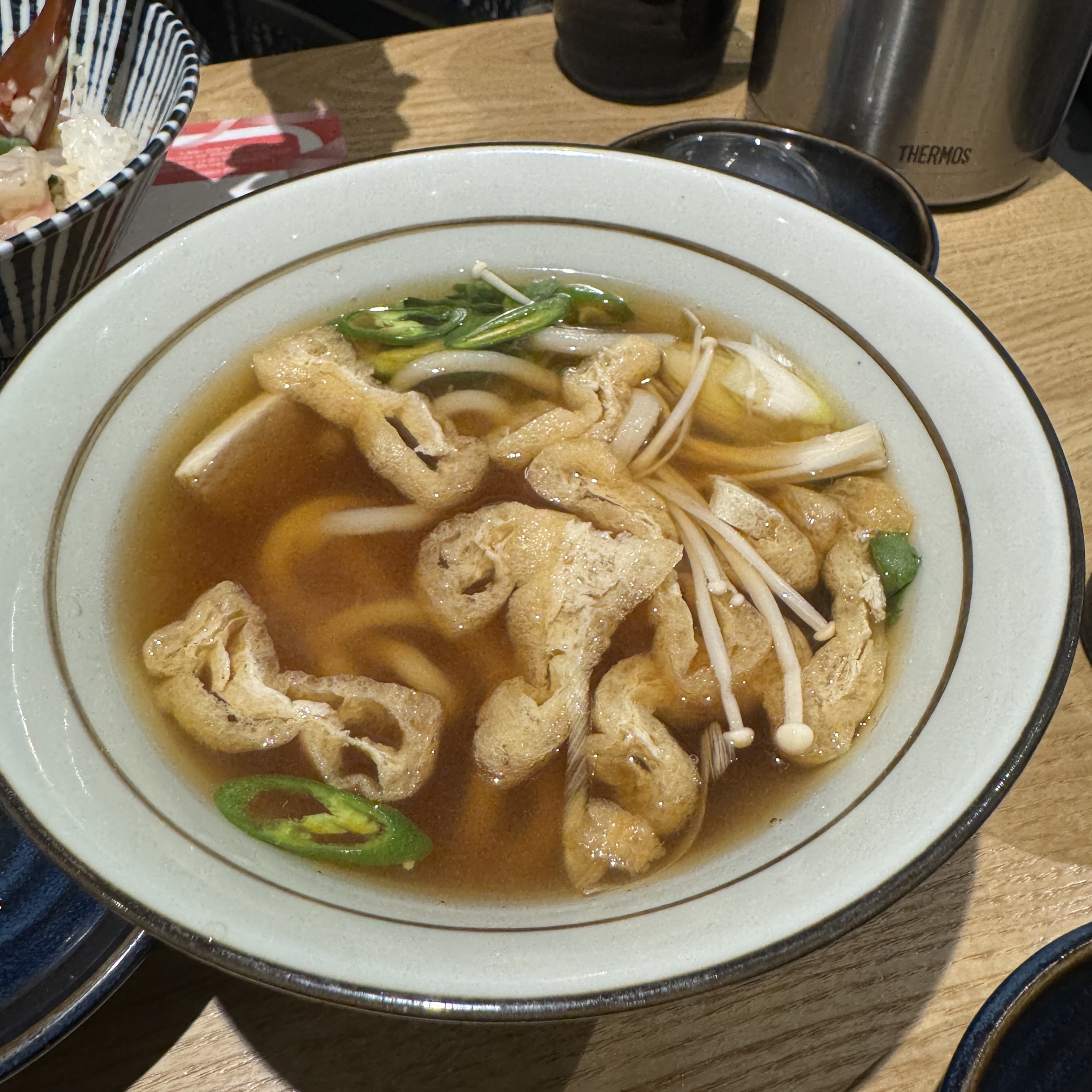 지인은 연어가 포함되었다고 지라시덮밥을 시켰고(사진은 없지만, 뭐 밥 위에 연어를 포함한 회고명이 올라간 덮밥으로 지라시란 말이 흩뿌리다 그러니까 우리가 흔히 아는 찌라시라고 생각하면 된다.), 둘이서 나눠 먹을 가츠오우동 하나 시켰다. 가츠오우동은 별로. 이유는 면발에 국물맛이 안 배어 있어서 맛있다는 생각이 안 들더라. 지라시덮밥은 못 먹어봤지만 지인 말로는 맛있다고.