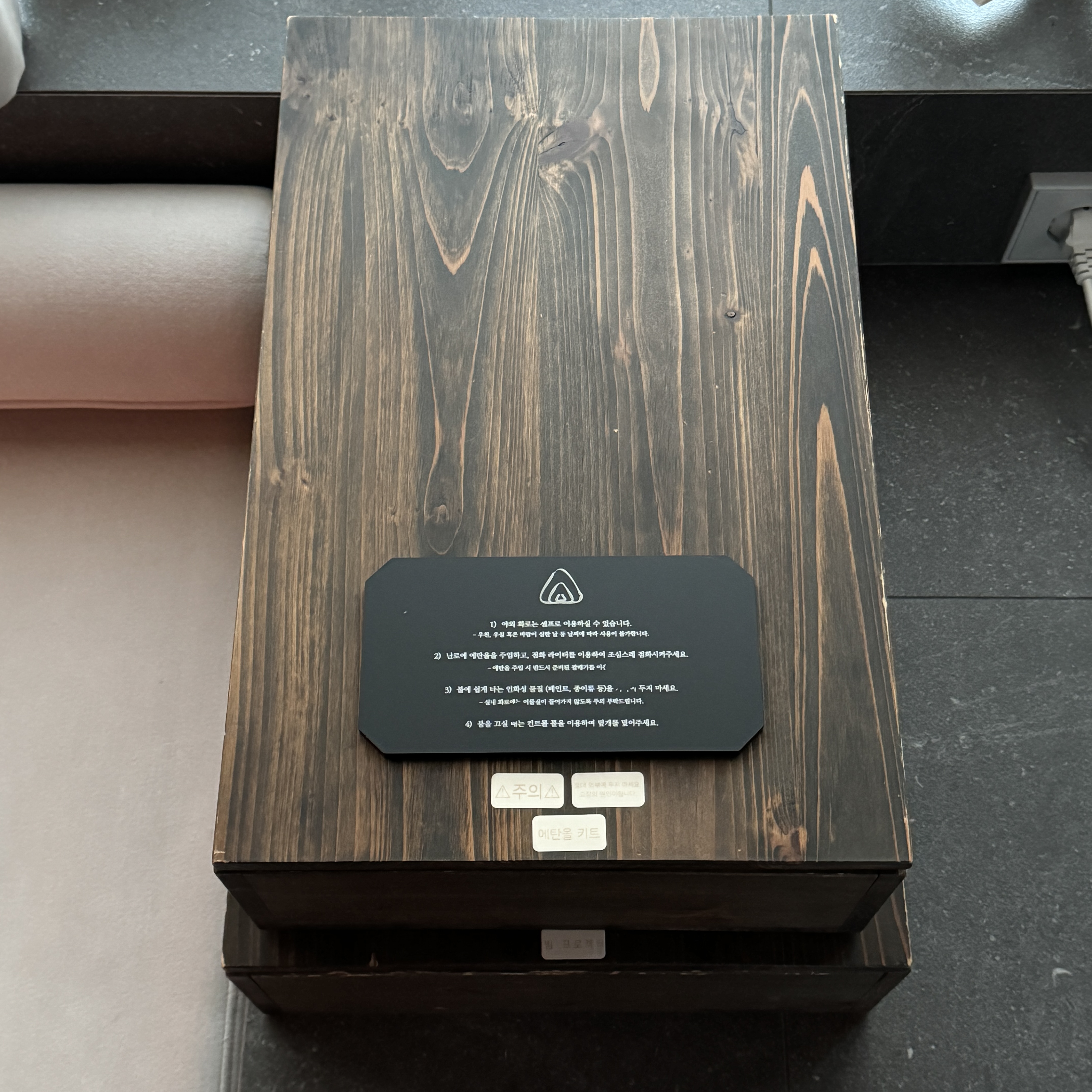 여긴 밤에 캠프 파이어(?)를 즐길 수 있는 공간. 캠프 파이어하면 장작이 있어야 하고 그런 건 또 청소하기 번거로우니 이렇게 구성한 게 아닌가 싶다. 알코올 넣고 불 붙여주면 되는데 조금 뭔가 부족한 감이... 알코올이나 그런 건 다 준비되어 있다.