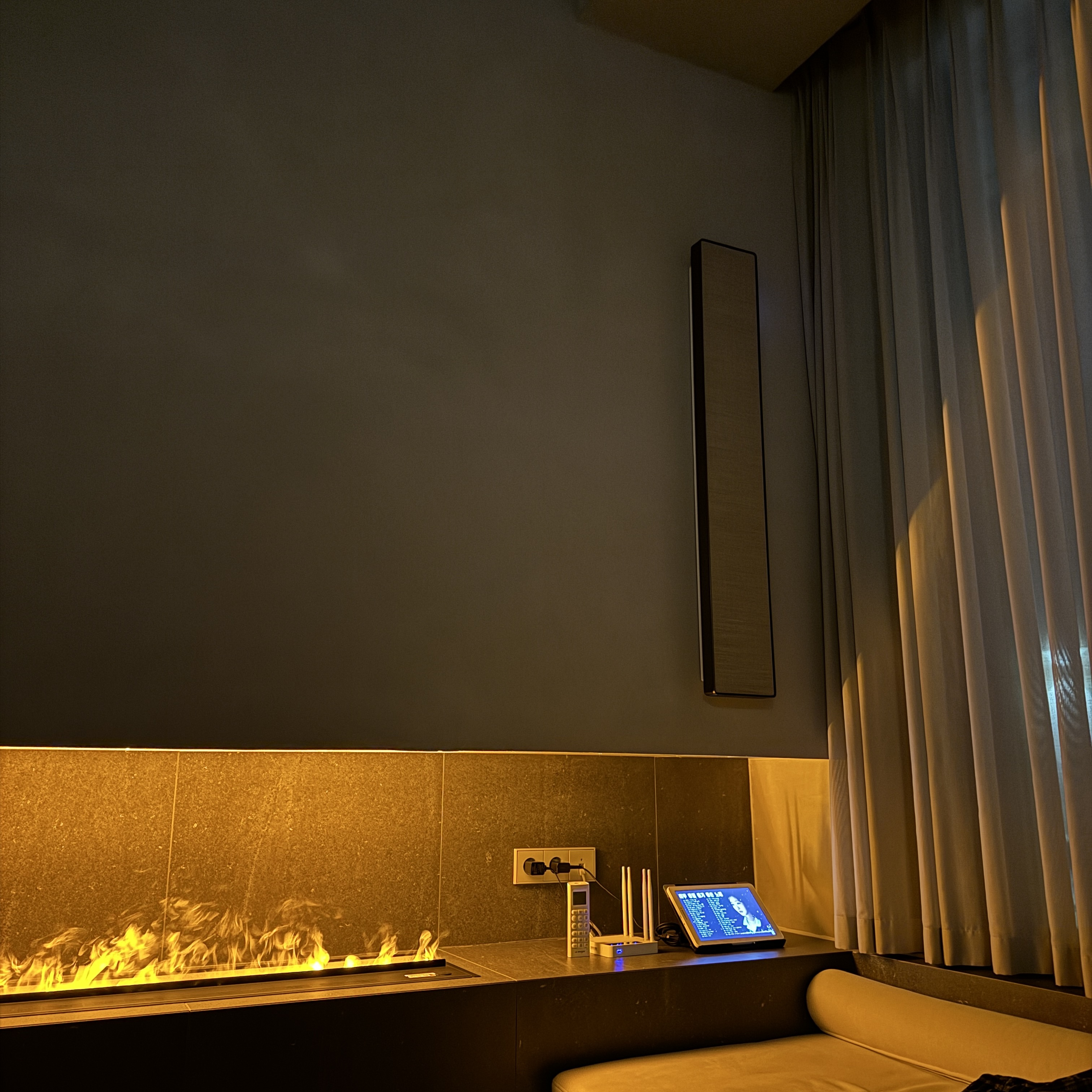실내에 들어오면 기분 좋은 향이 난다. 곳곳에 방향제를 둬서 그런데, 요즈음은 호텔을 가도 향으로 호텔의 이미지나 느낌을 전달하듯, 여기 '자발적 고립'도 그런 듯. 들어오면 보이는 게 바로 거실이다. 흑과 백의 조합으로 모던한 느낌으로 잘 꾸며놨다. 벽난로는 실제 불이 아닌 연기에 LED를 쏘아서 불꽃을 연출한 거다. 이거 얼마 안 한다. 테무에서 사면. ㅎ 저렇게 매립형으로 나온 게 있는지는 모르겠지만. 그리고 와이파이 있고, 갤럭시 탭 있더라. 음악 들을 때 유용.