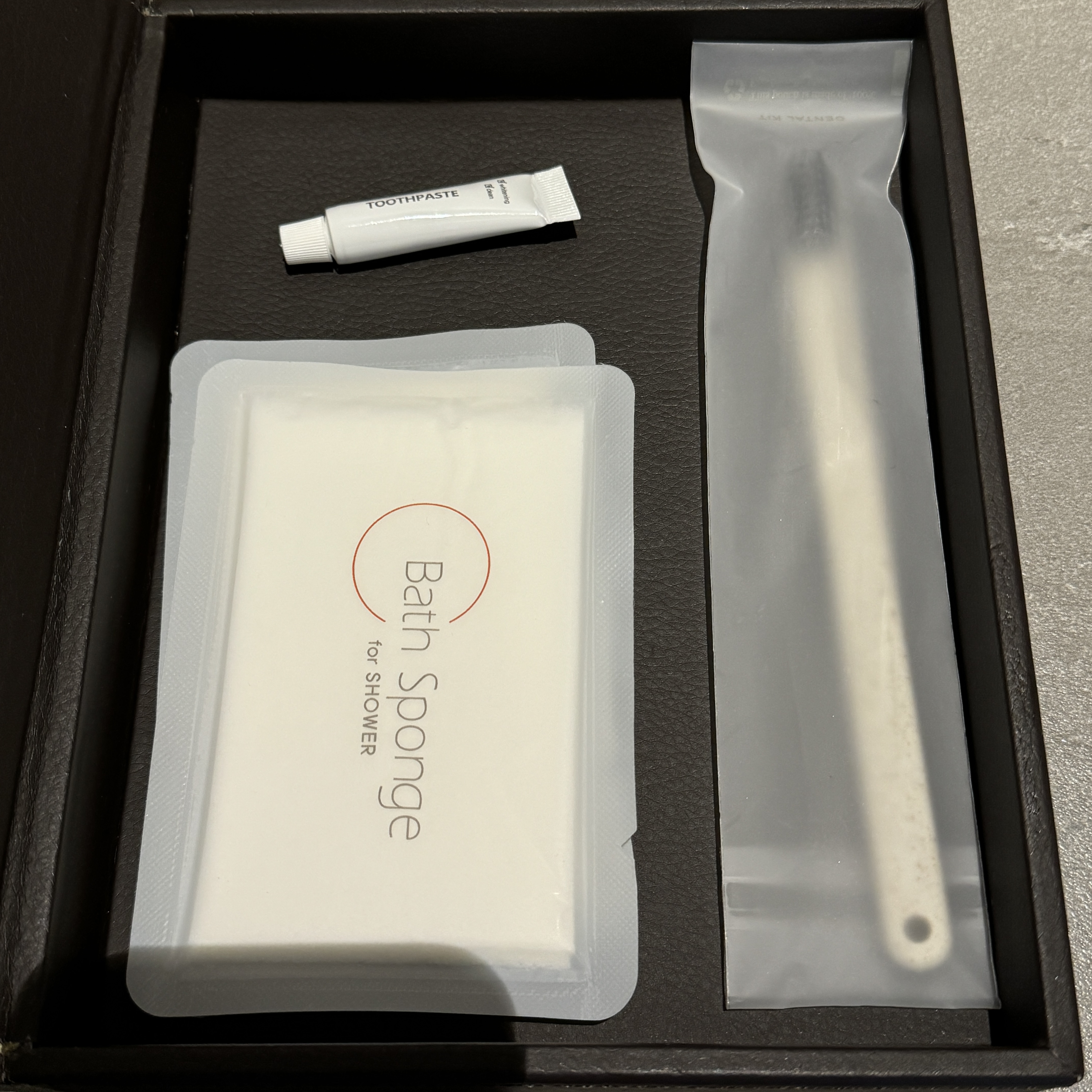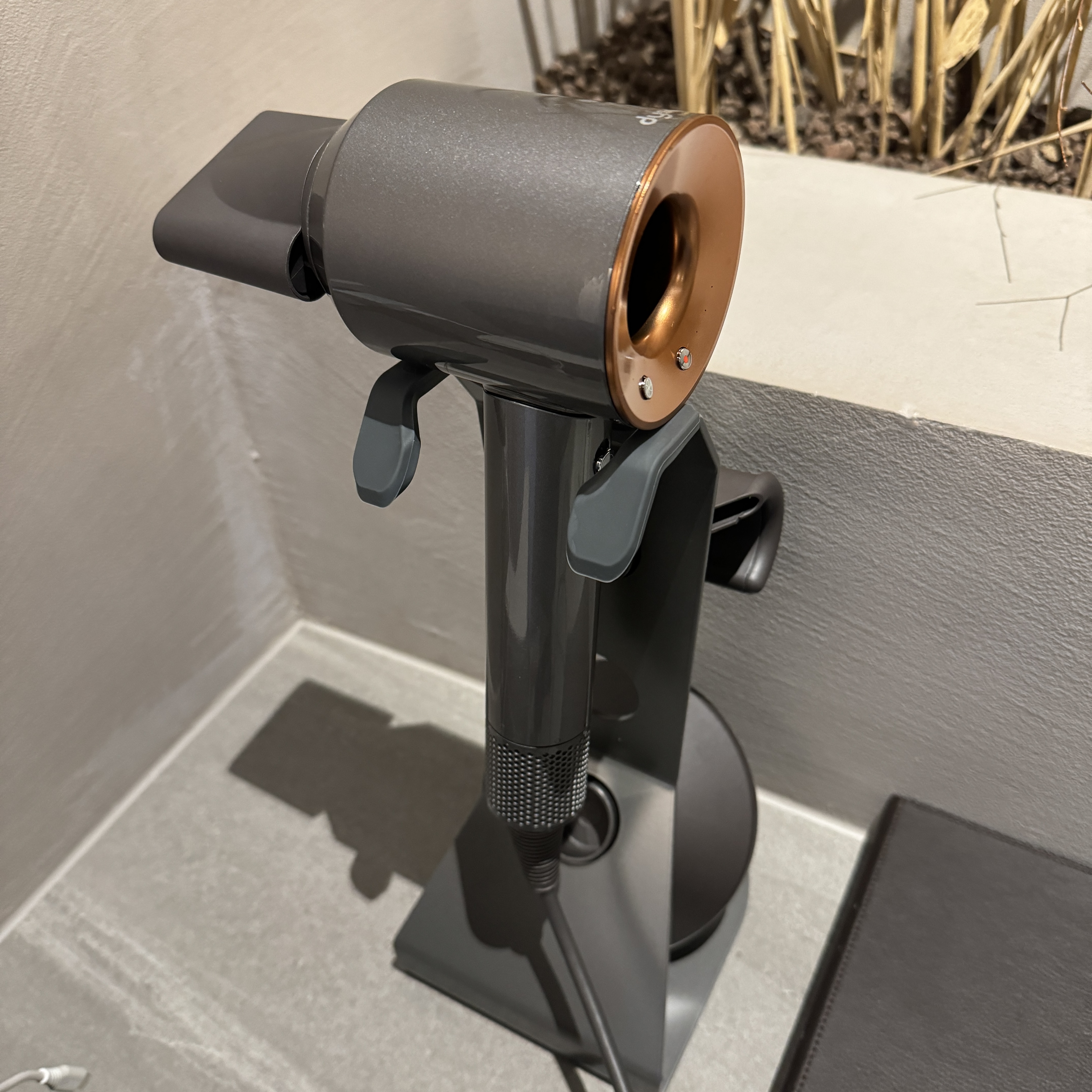 이건 거실과 침실 사이의 세면대, 다이슨 헤어 드라이기가 비치되어 있다. 검은색 박스 안에는 칫솔, 치약과 같은 어매니티.
