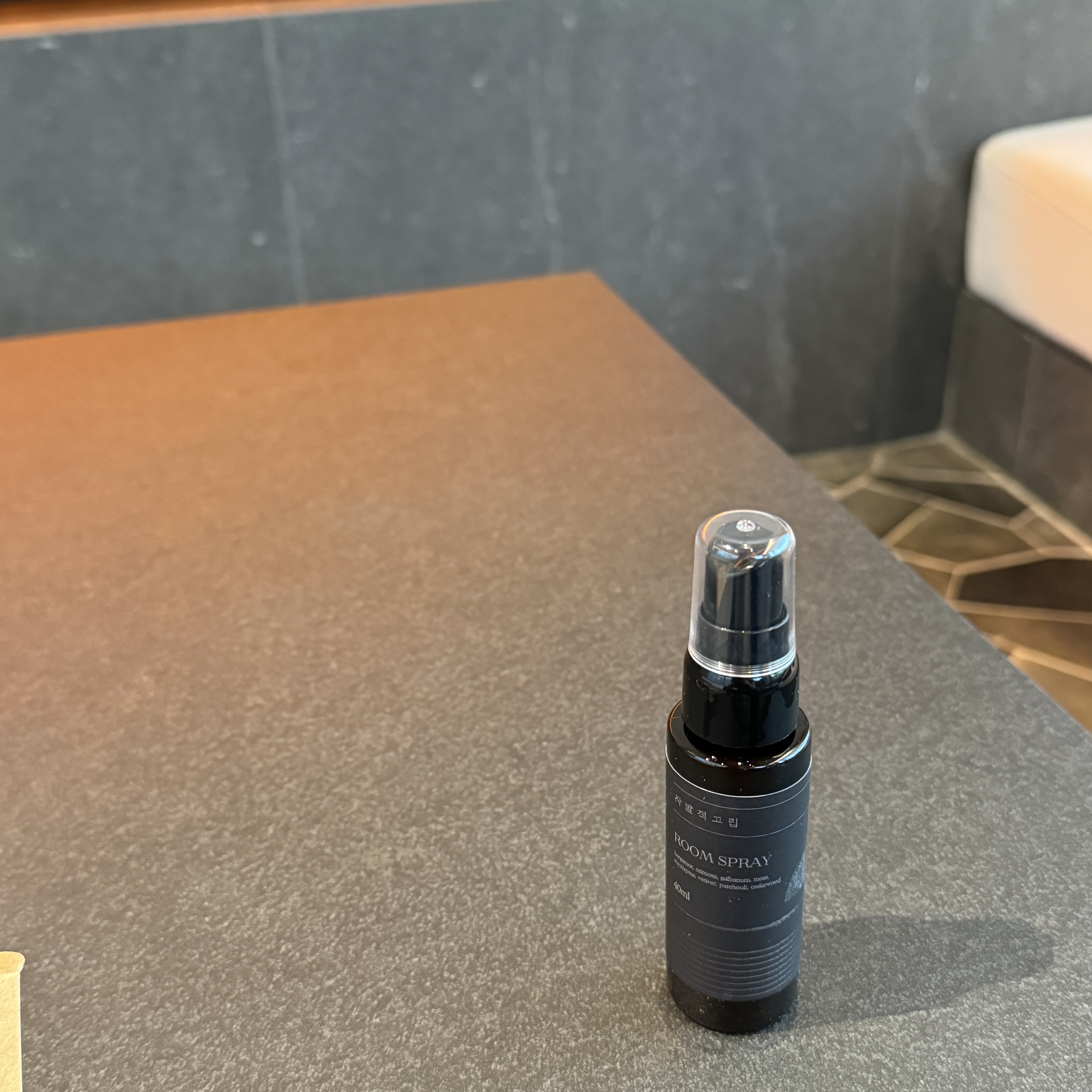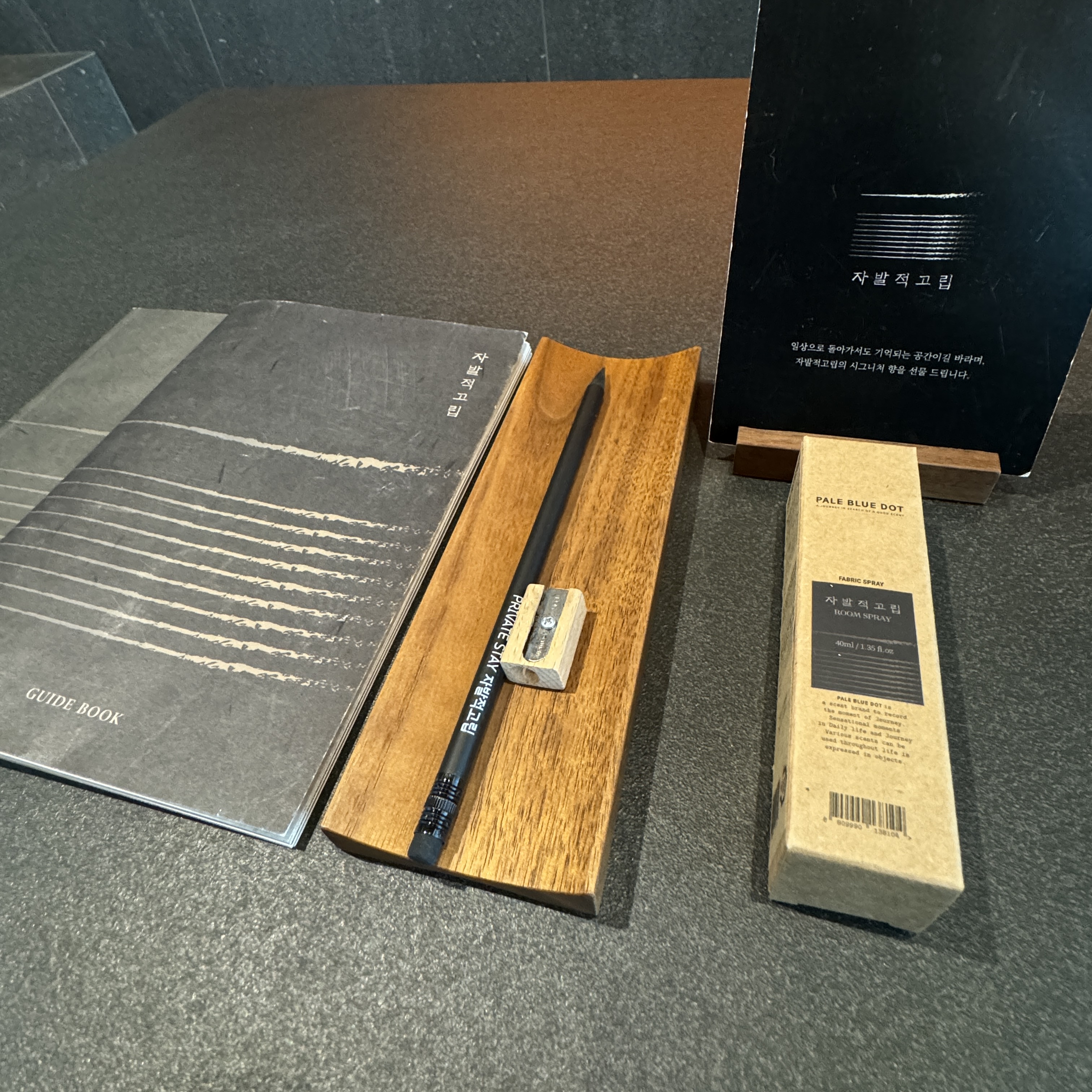 테이블 위에는 안내서, 볼펜, 방향제 스프레이가 있는데, 방향제 스프레이는 선물이더라는. 갖고 왔는데 아직 사용은 안 해봤다. 향은 '자발적 고립' 실내에서 나는 향이라고 하더라.