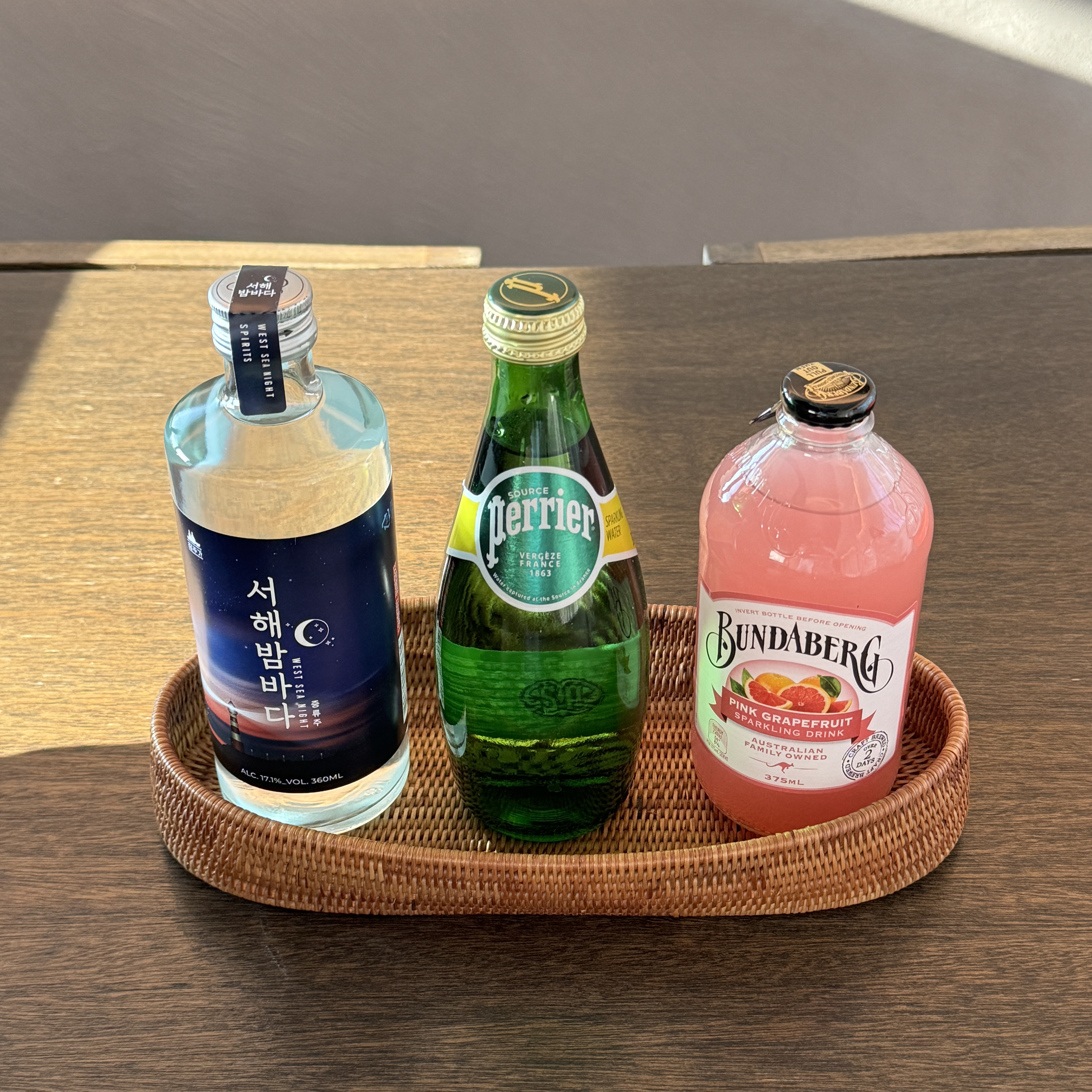 테이블 위에는 웰컴 드링크(?)가 있는데, 서해밤바다는 소주더라.
