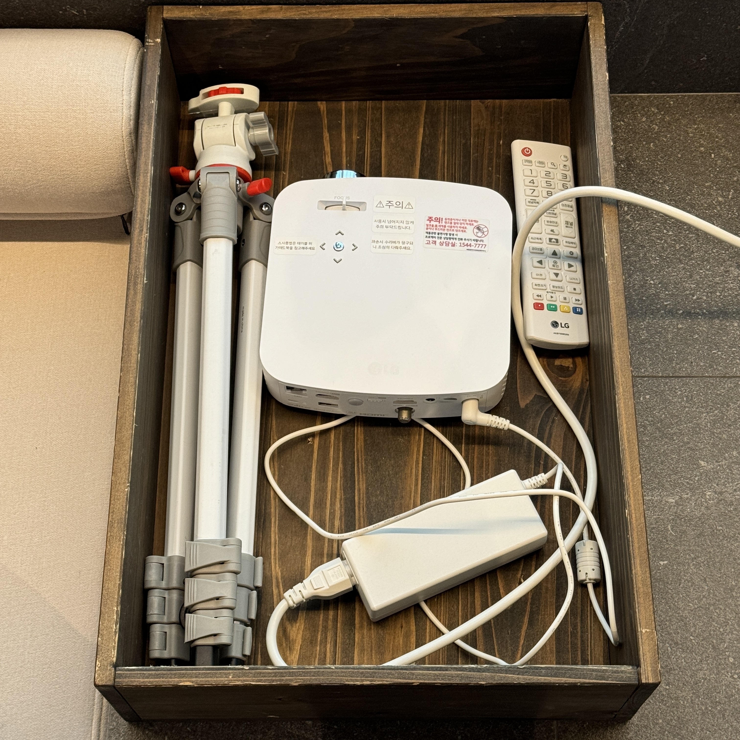거실 한 켠에는 나무 상자가 두 개 있는데, 하나는 바깥에 캠프 파이어에 필요한 물품이 담겨 있고, 다른 하나에는 빔 프로젝터 있더라. 이 빔 프로젝터로 밤에 '파묘' 봤는데, 좀 또렷하다고는 해도 잘 안 보이는 부분도 있어 아쉬운 점이 있는 프로젝터였다.