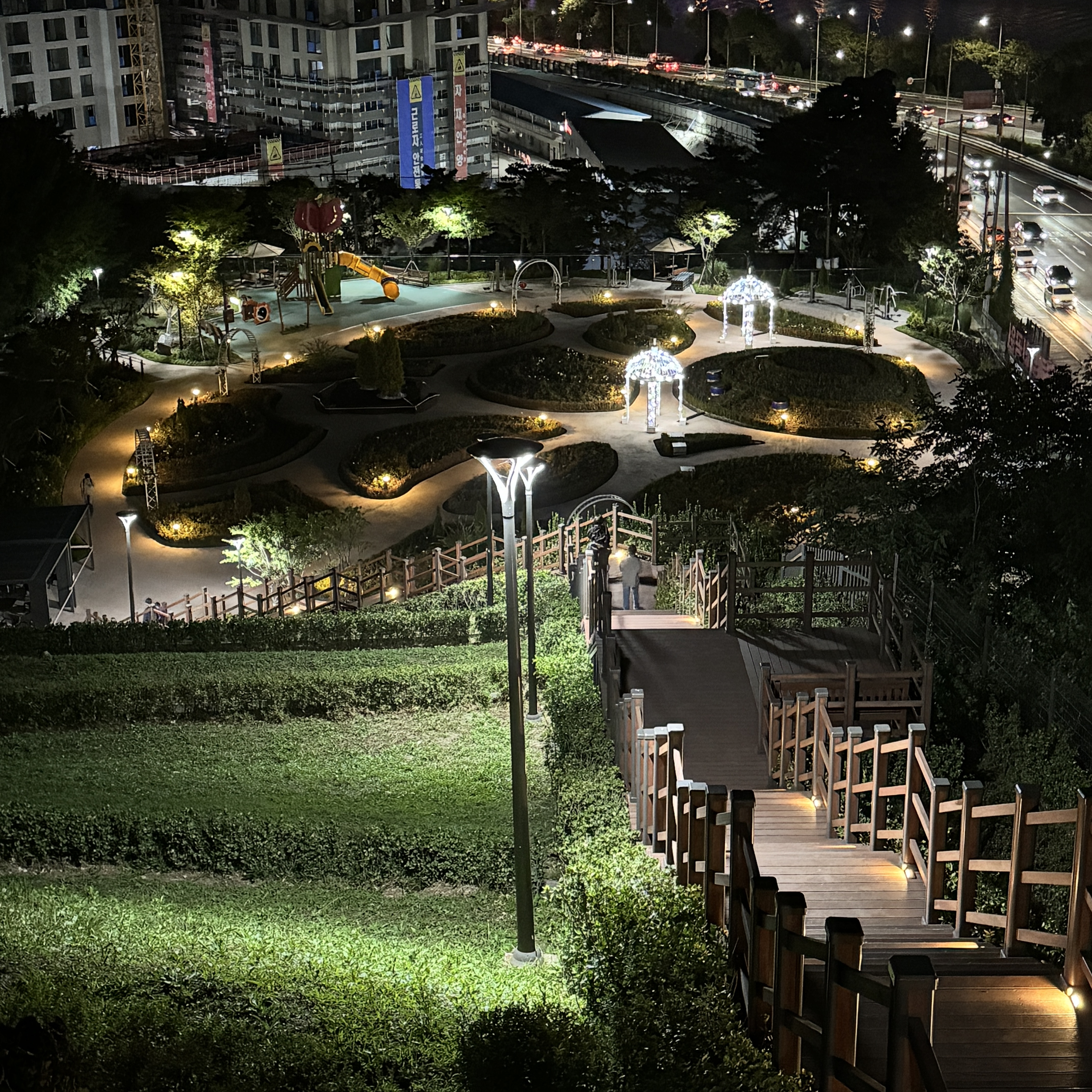공원에서 연결된 계단을 따라 내려가면, 또 스팟이 하나 나오는데, 첨에는 놀이기구가 보이길래 아파트 놀이터인가 했는데 그렇진 않더라. 사진 찍기 좋은 스팟도 있고. 또 내려가는 길이 있는 거 보니 다른 데랑도 연결되어 있는 거 같은데, 주차해둔 반대 방향이라 내려가보진 못했네.
