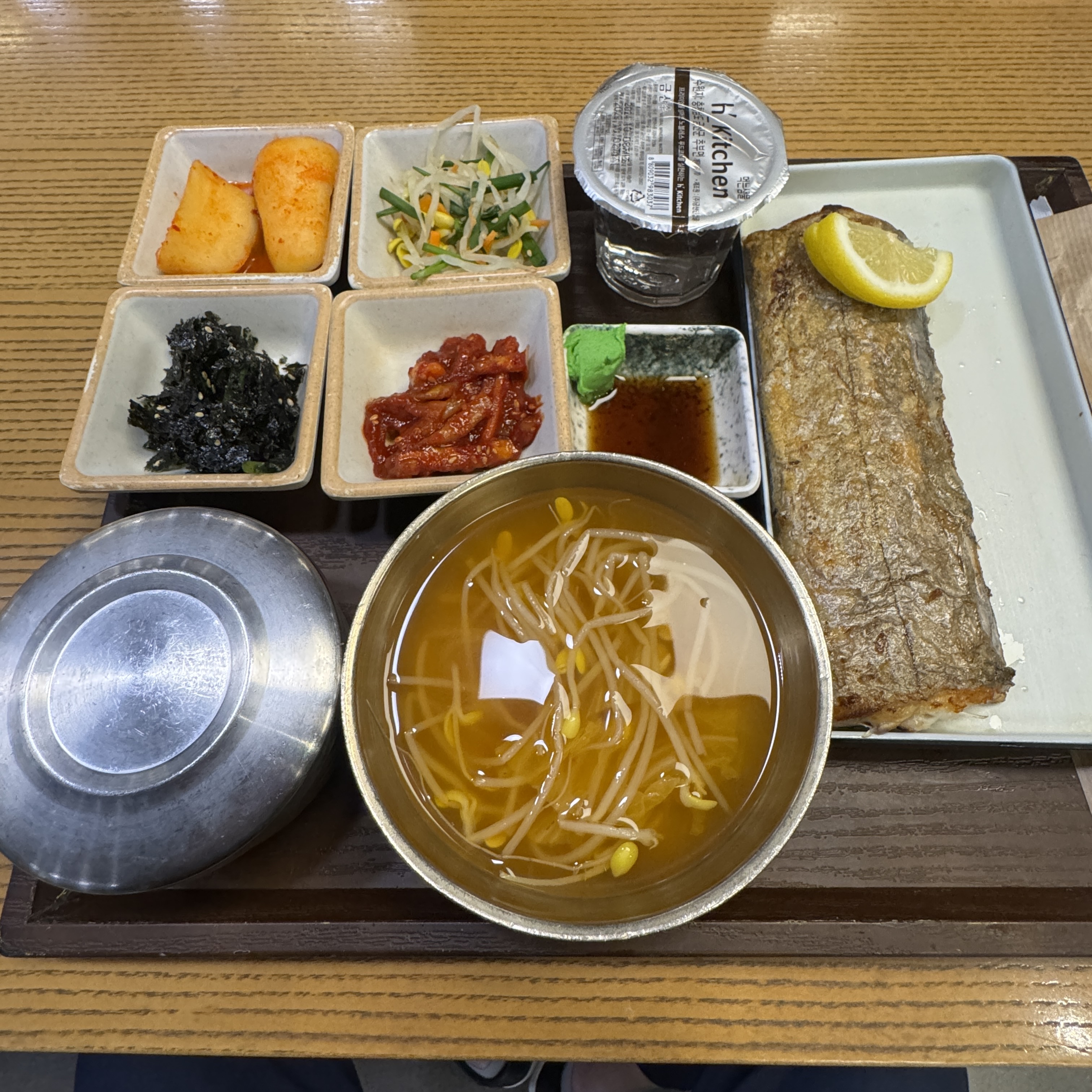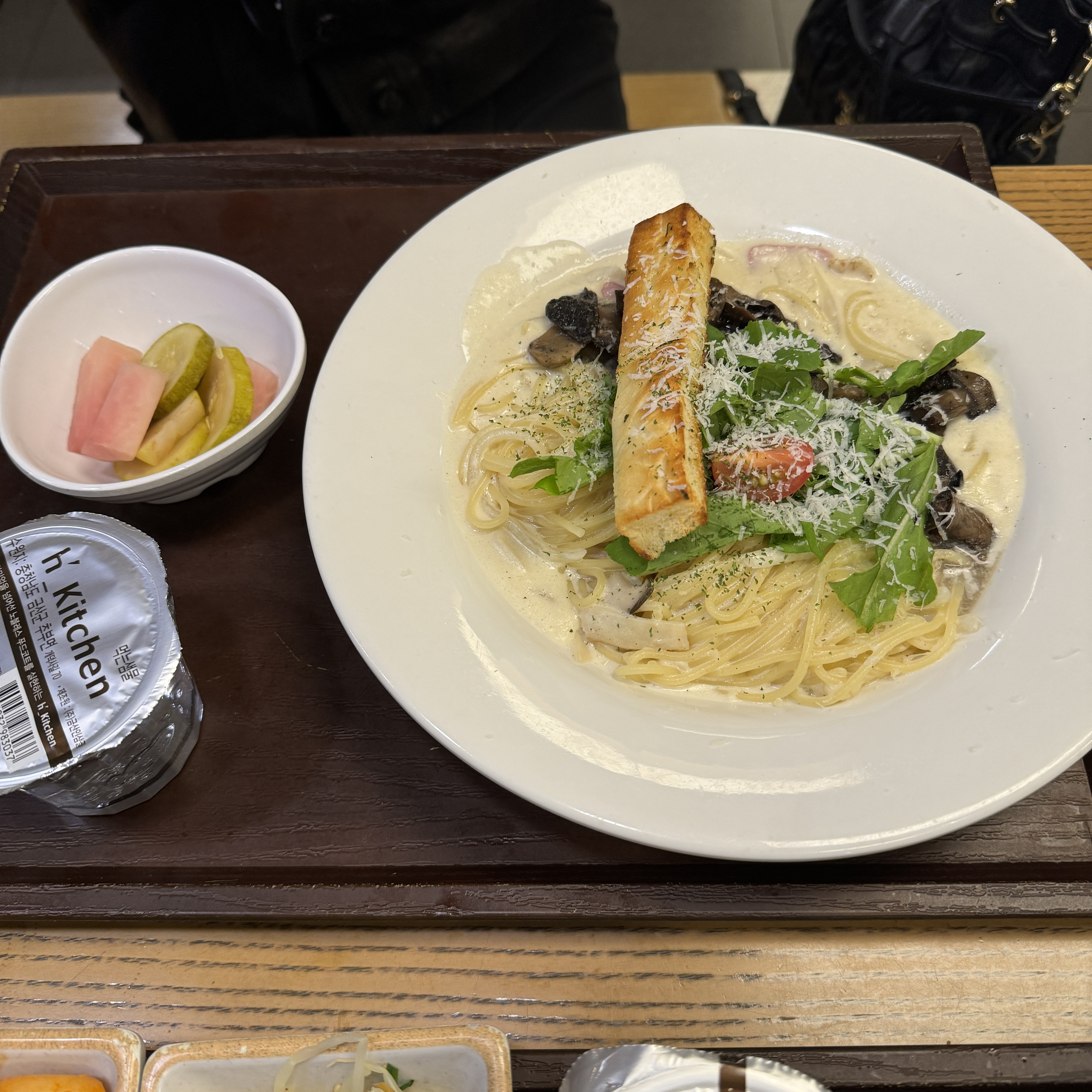 지은 파스타, 나는 갈치구이. 한국 사람이면 밥을 먹어야. 요즈음 알타리 무 비싸다던데 알타리 무김치 있어서 좋았던. 근데 h_kitchen에 식수대 있는데, 굳이 왜 또 물을 제공하는 건지 모르겠다. 여튼 음식은 괜찮은 거 같다. 가격 대비. 비싸지도 않고.