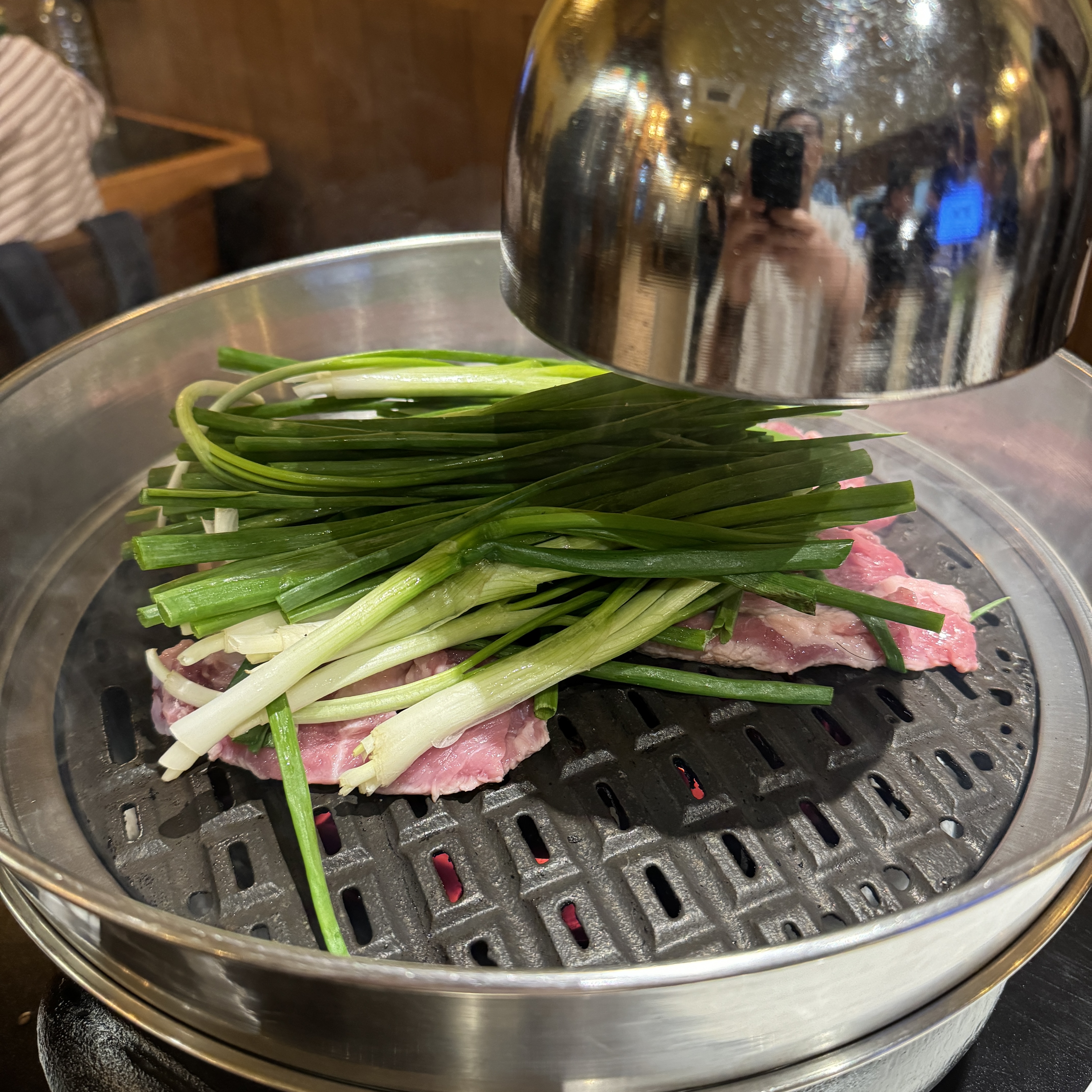 우리가 시킨 건 난축 흑돼지 세트(650g, 오겹살 200g, 목살 200g, 생갈비 250g + 쪽파 100g, 72,000원) 뭐 200g 1인분이라고 하면 3인분 정도니까 고기 먹으려면 이 정도는 먹어야지. 근데 생각보다 고기가 그리 맛있지는 않더라. 프리미엄이라고 하는데, 글쎄요. 오히려 나는 성수동의 냉동삼겹살집인 잠수교집 고기가 훨 맛있더라는. 그래도 배터지게 잘 먹긴 했다. 게다가 여기는 고기를 직원이 구워줘서 좋아. 그거 때문에 프리미엄인 듯.