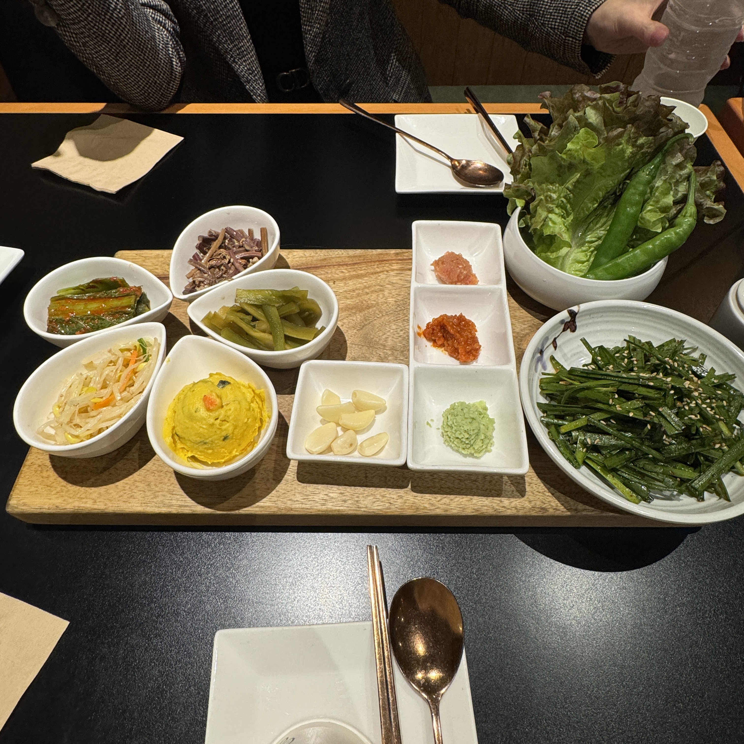 찬은 정갈하게 나온다. 특히나 내가 좋아하는 찬이 있어서 좋았다는. 상추 줄기. 아삭한 식감 좋아한다. 그리고 쌈 싸먹을 때 필요한 강된장. 근데 거의 먹지 않았다. 별도로 있는 소금(돼지고기와 궁합이 잘 맞는단다) 찍어 먹는 게 훨씬 나은 거 같아서.
